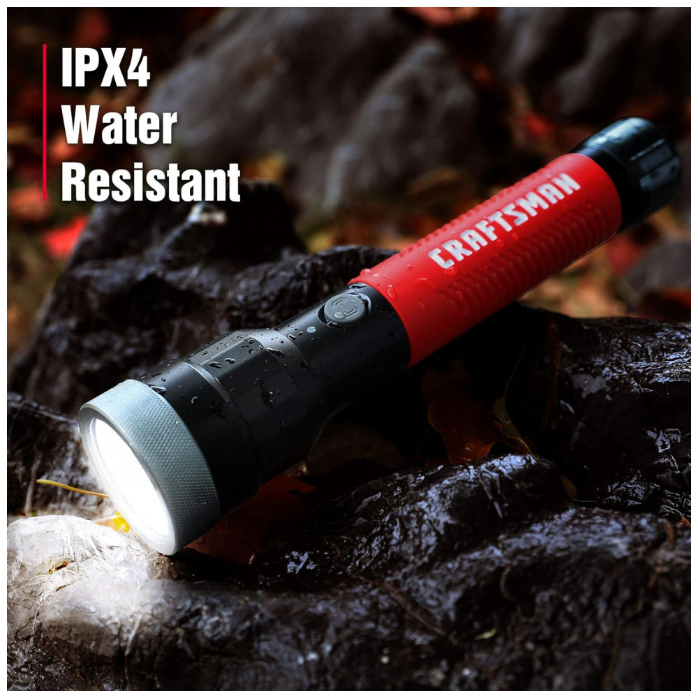 Lanterna de Led, 700 lumens com 6 Baterias AA alcalinas incluídas, CRAFTSMAN CMXLFAG65280, Preto: BRILHANTE COM 700 LUMENS REAIS A lanterna Craftsman emite uma potência máxima de até 700 lúmens e lança um feixe de 300 metros, tempo de execução de longa duração até 3 horas por 6AA e 3AA Baterias alcalinas IMPACTO E RESISTÊNCIA AO TEMPO O nível IPX4 permite que a água espirre de qualquer direção sem danos.