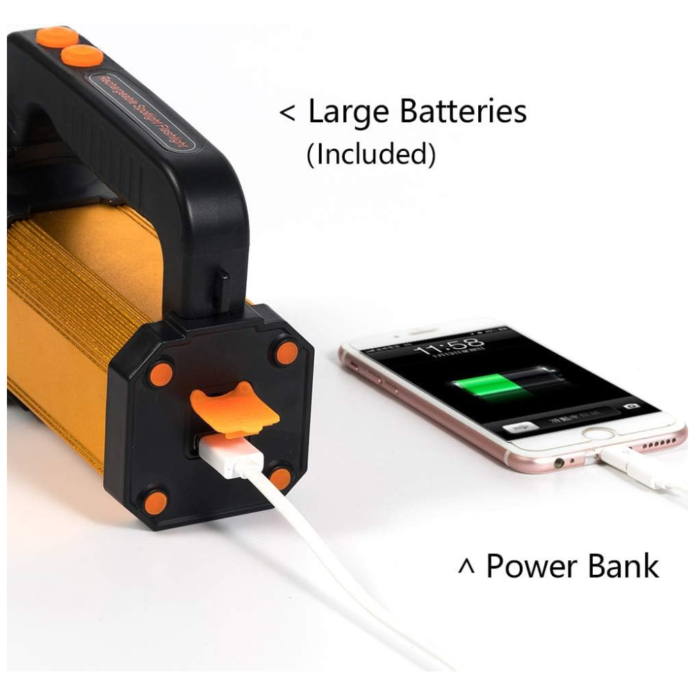 Mais funções Super brilhante, longa distância do holofote lanterna lateral de inundação alça superior alça removível a alça inferior desdobrável também está girando o tripé, incluído Bateria grande recarregável alimentada Banco de potência de saída USB para carregar o telefone alça de ombro de transporte incluída.