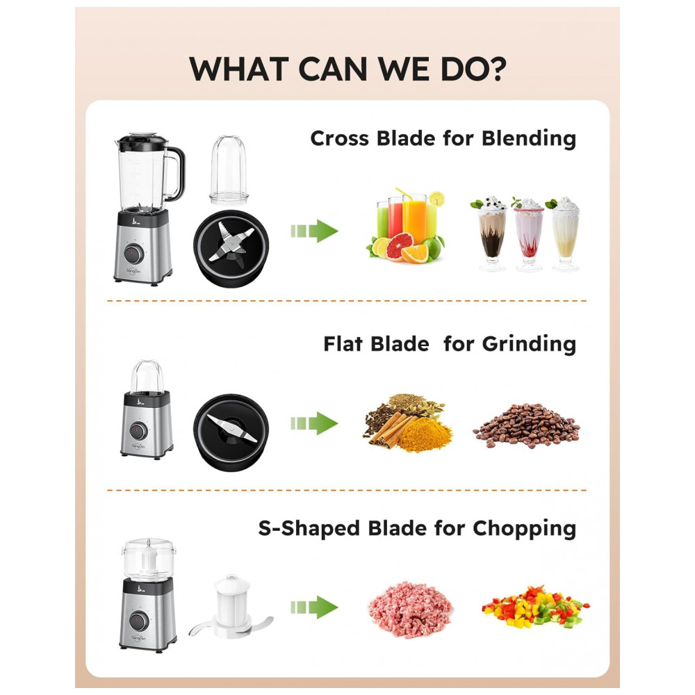 É perfeito para preparar shakes de proteína, moer café, nozes, frutas, vegetais e até processar carne.