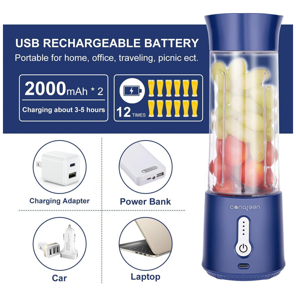 Liquidificador de Bancada Portátil 500 mL para Vitaminas, Recarregável 4000 mAh, AIKIDS, Azul: Apresentando o Liquidificador Portátil Potente Atualizado Equipado com 6 lâminas de aço inoxidável 304, este liquidificador oferece uma alta rotação de 18000 rpm, transformando rapidamente frutas e vegetais em smoothies incríveis, sem deixar pedaços de frutas ou gelo.