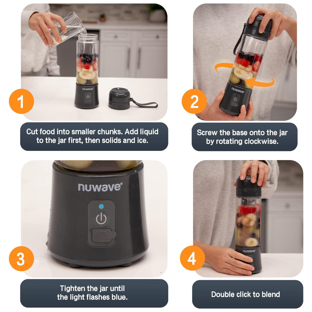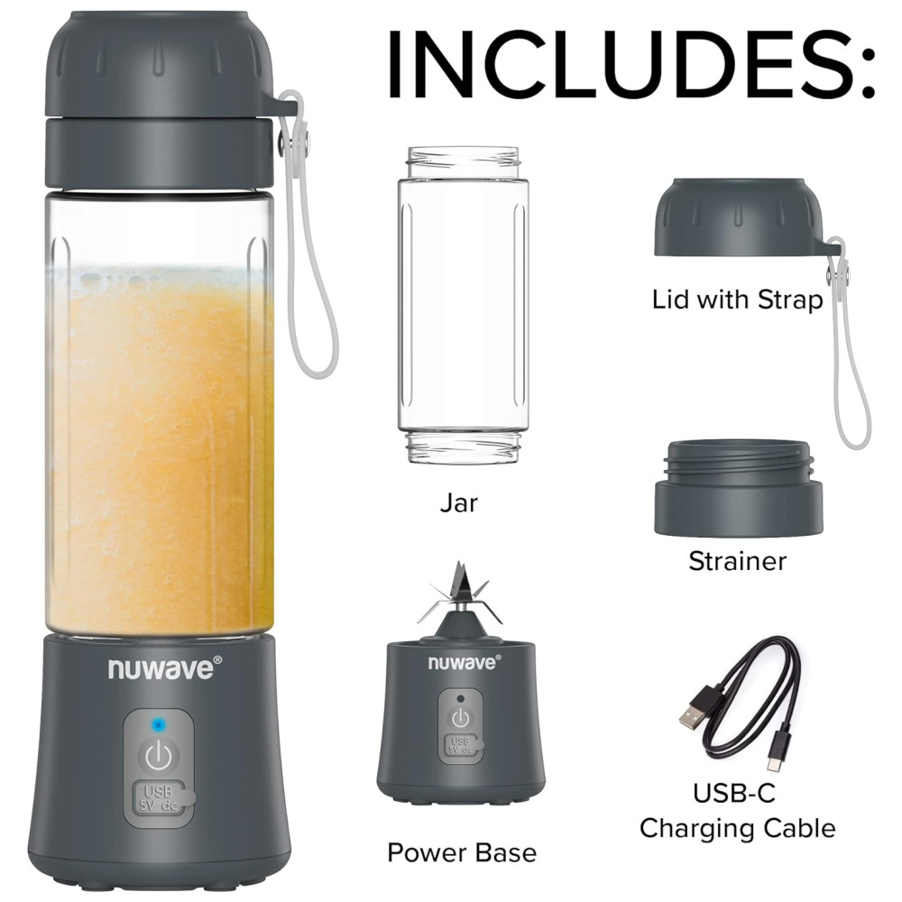 Liquidificador Pessoal Portátil 530mL com USB C Recarregável, Lâmina de 6 Peças para Triturar Gelo e Sem BPA, Nuwave, Cinza