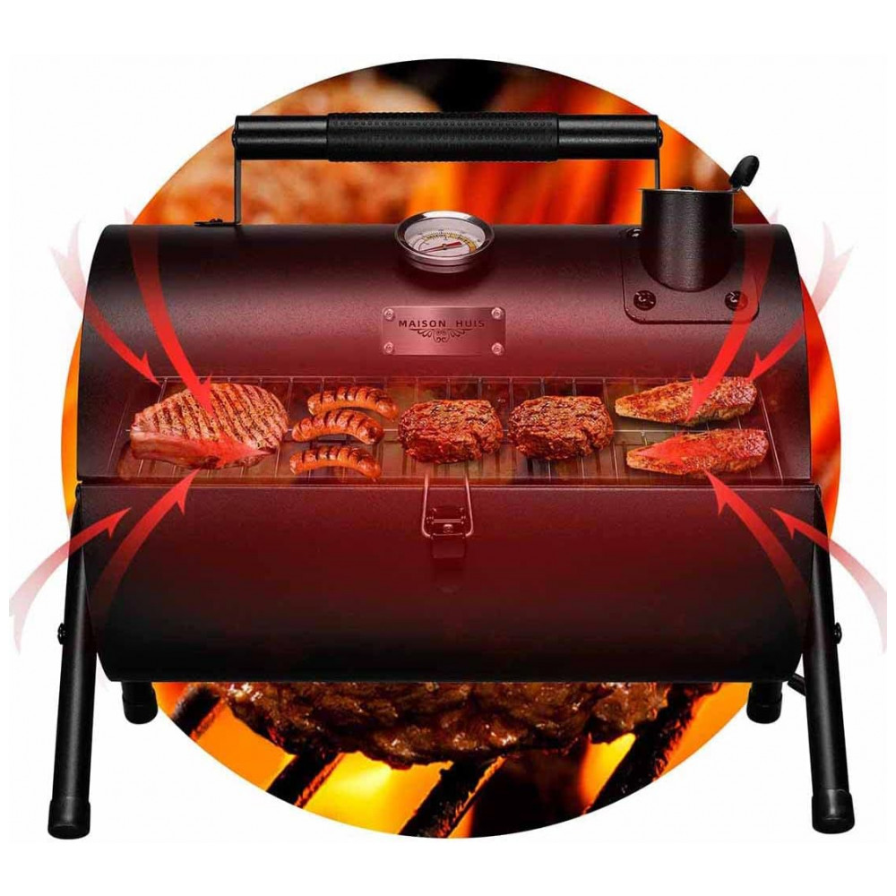 Rico em sabor A churrasqueira MAISON HUIS Smoker possui grelha de 35x que você pode cozinhar 6 hambúrgueres, 16 cachorros quentes ou salsichas, 8 peitos de frango, 4 bifes ou 2 quilos de peixe.