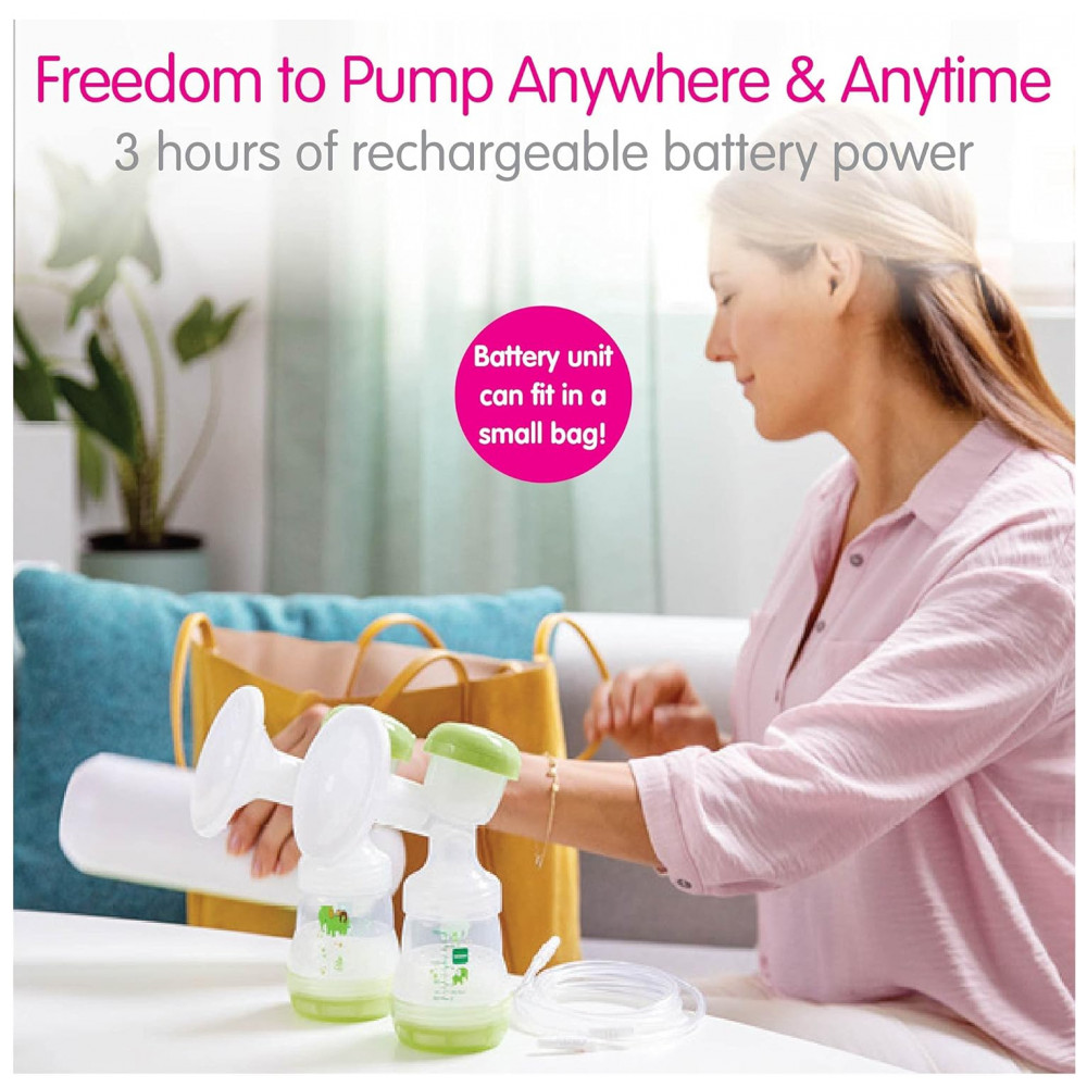 Our MAM 2 in 1 double Electric Breast Pump also includes a rechargeable battery unit, two 5 oz.