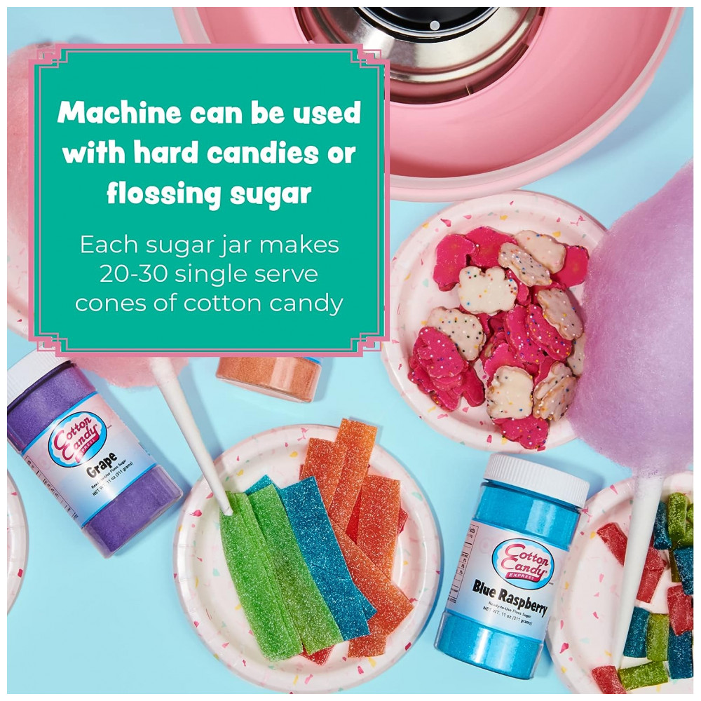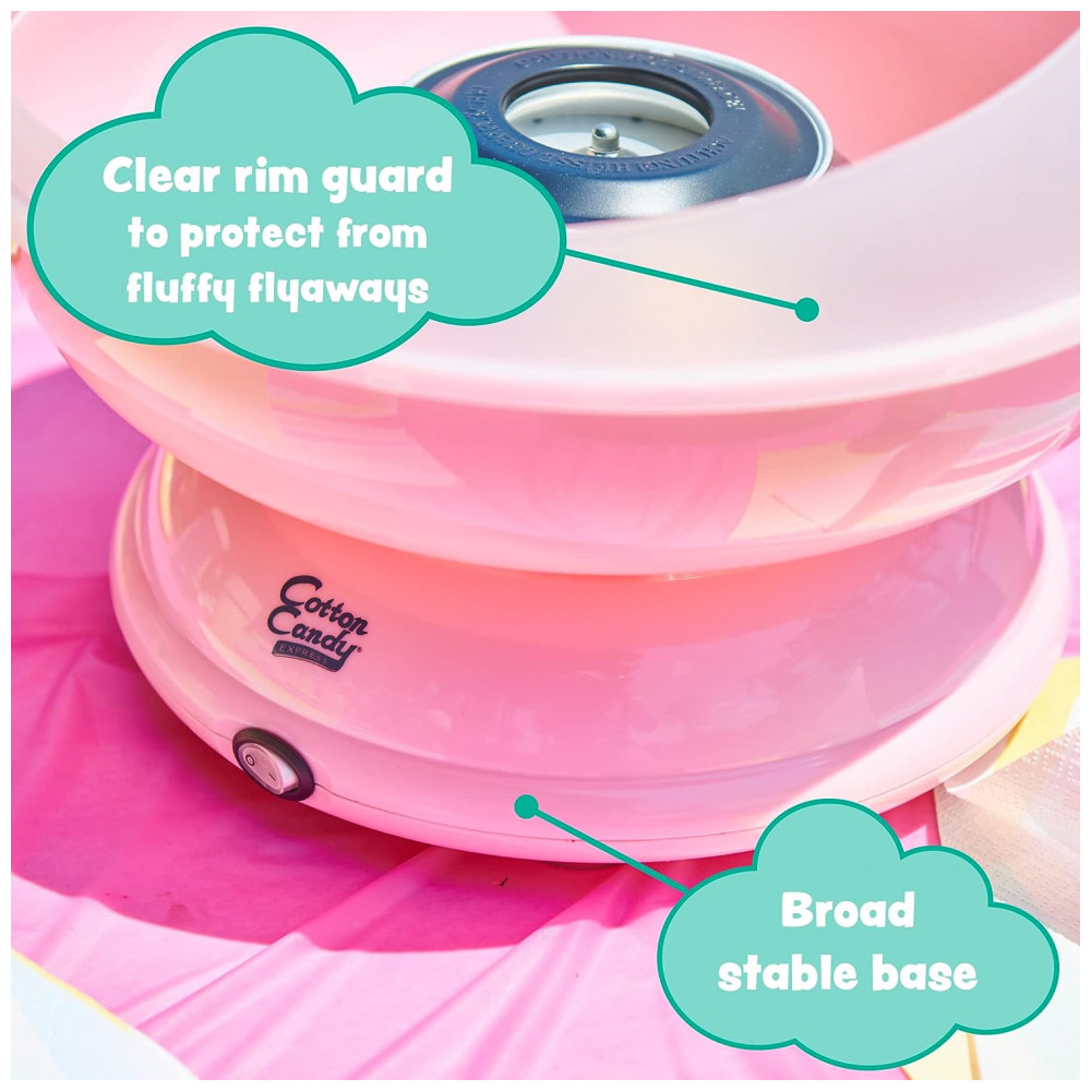 Incluído Máquina de algodão doce rosa Cotton Candy Express, uma colher de açúcar de fio dental rosa correspondente e 8 cones de algodão doce listrados. Uso Ótimo para fazer algodão…