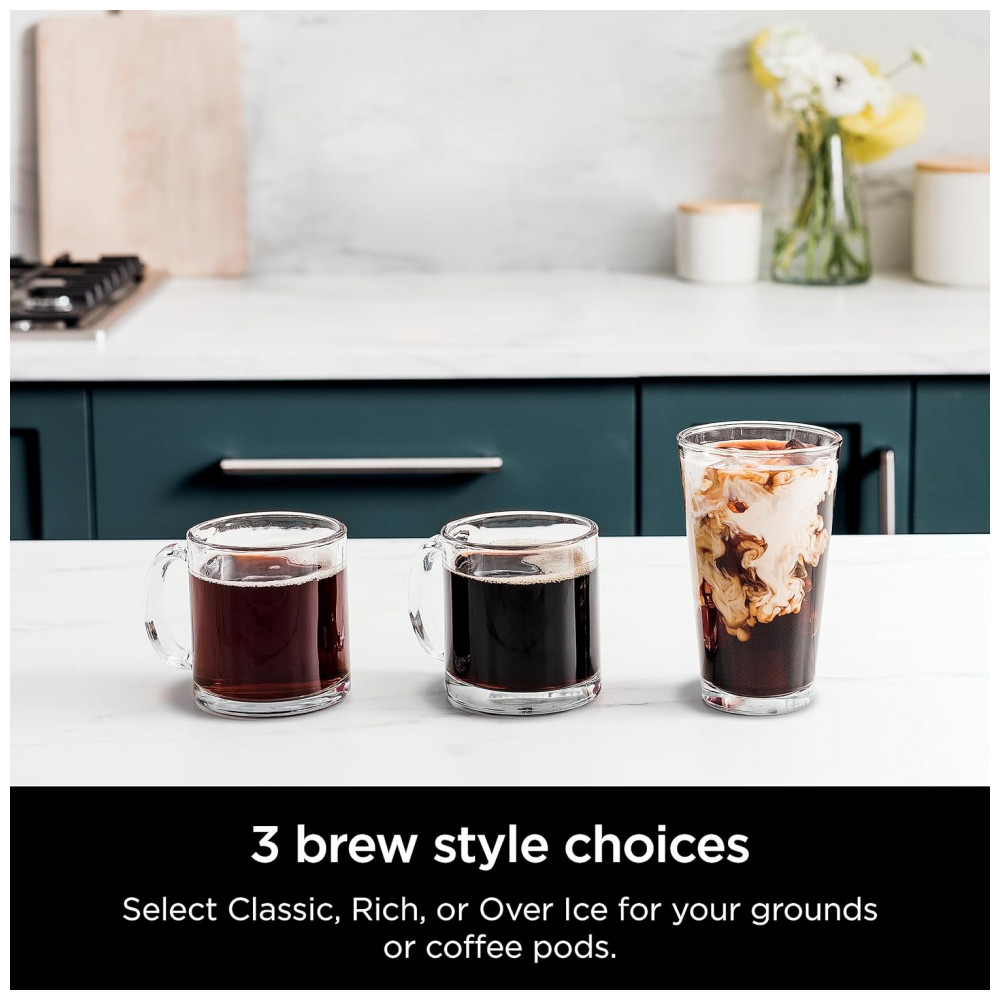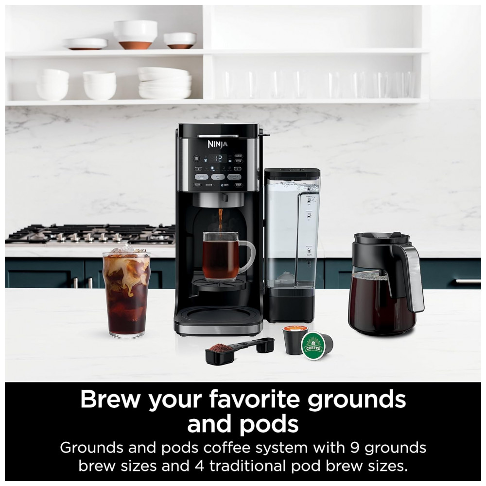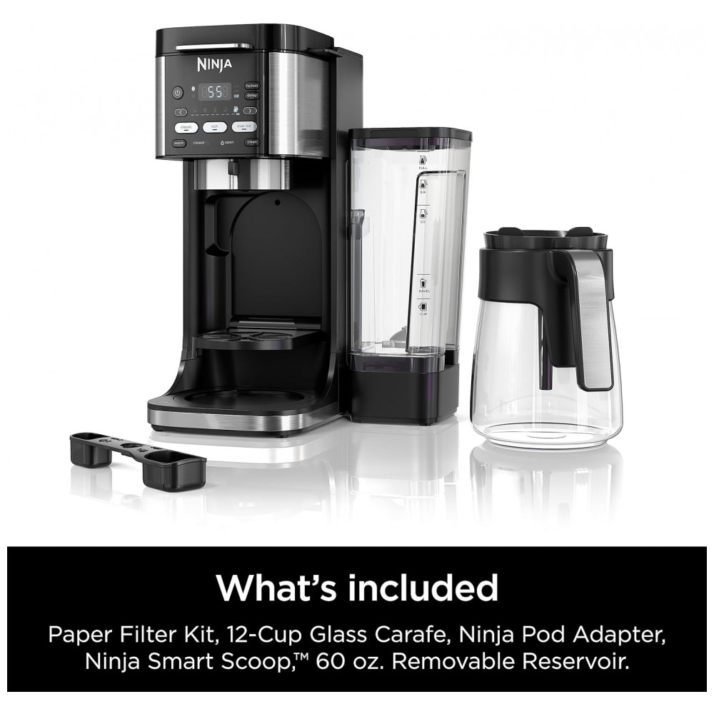 O que está incluído Máquina de café quente e gelada Ninja DualBrew, kit de filtro de papel, jarra de vidro para 12 xícaras, adaptador Ninja Pod e colher inteligente Ninja