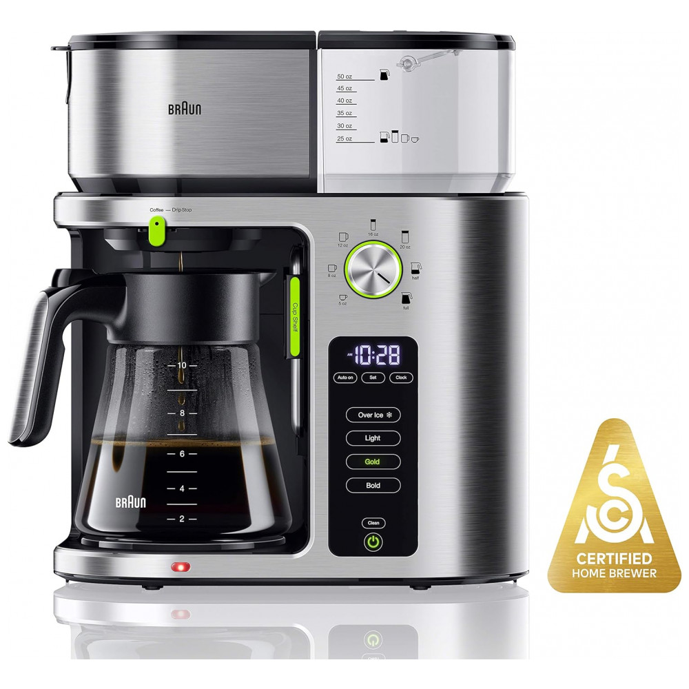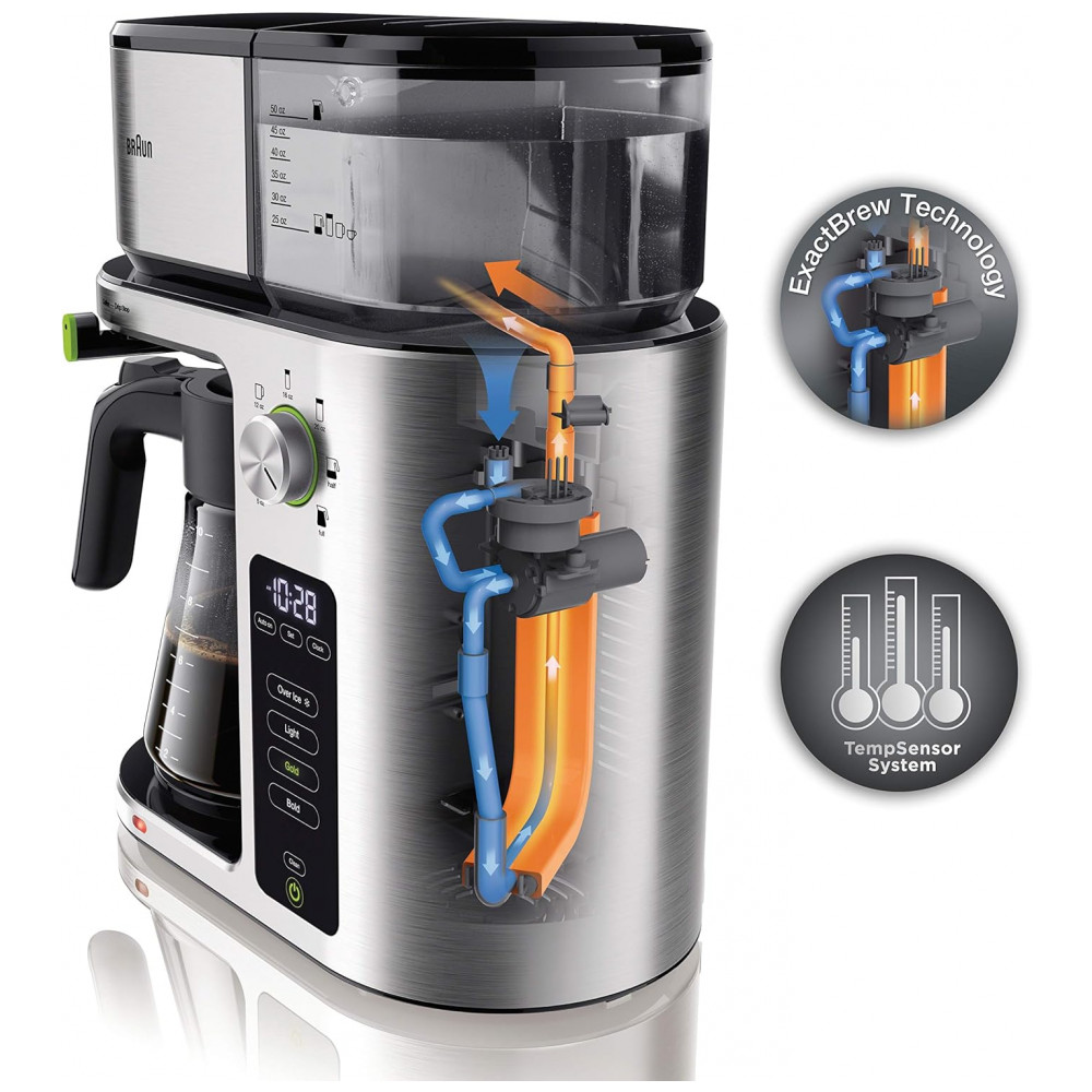 Sistema de preparo exato O sistema de preparo exato oferece um desempenho de preparo ideal consistente em cada xícara, calculando automaticamente a temperatura e a velocidade do fluxo de água para cada preferência de café Escolha de cerveja mais personalize seu café ao seu gosto bebida quente ou fria com a configuração ousada luz dourada sobre gelo com o toque de um botão A tecnologia exclusiva Fast brew oferece uma completa em menos de 8 minutos sem sacrificar o sabor Sistema de sensor de temperatura 3 sensores monitoram de perto as temperaturas ao longo do processo de fermentação para atingir os padrões de preparo SCA rapidamente e manter o café na temperatura perfeita Um café de qualidade Golden Cup SCA da Special Coffee Association garante um ótimo de fermentação para um excelente desempenho em cada preparação Mostrador multi serviço escolha o tamanho ideal de cerveja a partir de 7 opções diferentes, desde uma xícara única sem cápsula, serviço direto em uma caneca de viagem até uma garrafa cheia com um simples girar de um botão Indicador de fresco saiba sempre que o seu café fresco está fresco com o visor visível Design longo da forma O formato e estreito retém exclusivo a embalagem, jarra ou desenvolvimento de um sabor amargo de café livro de BPA Indicador de superfície quente acenda uma luz indicadora de superfície quente abaixo da placa quente que permanece acesa até que a placa esfrie.
