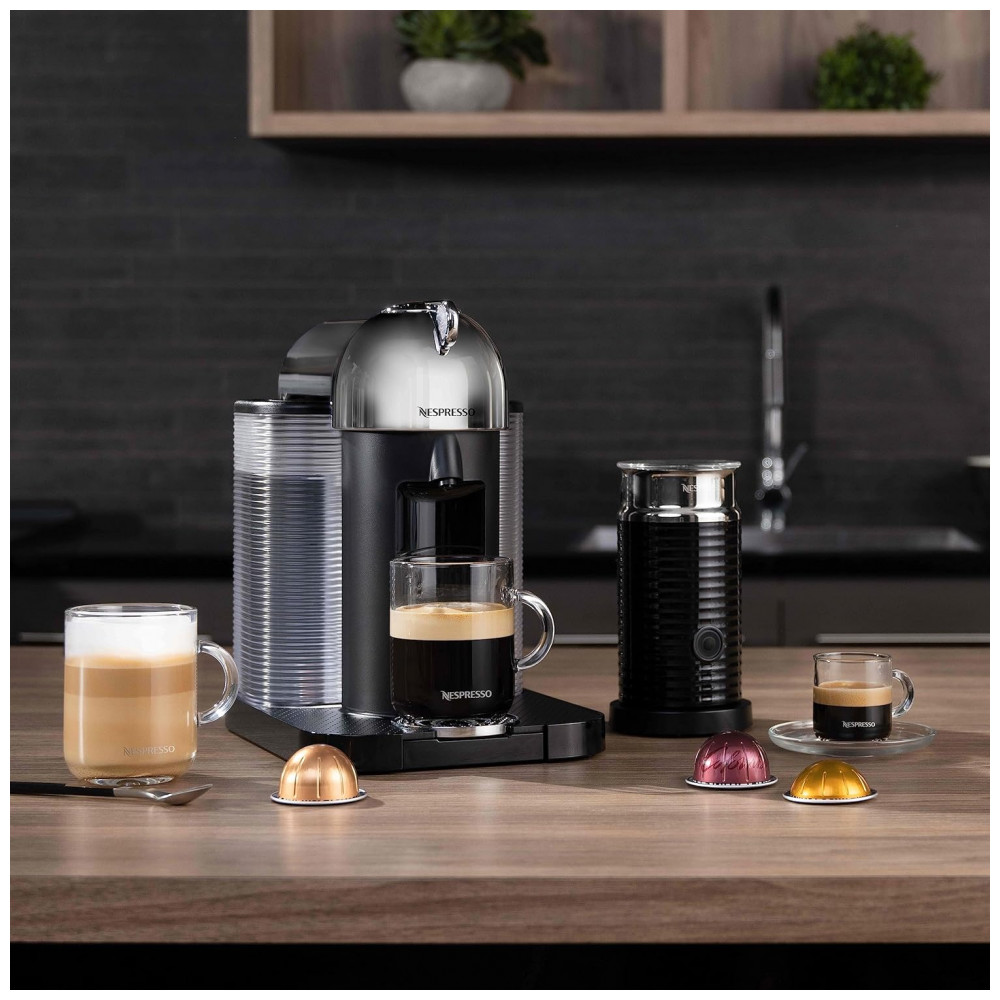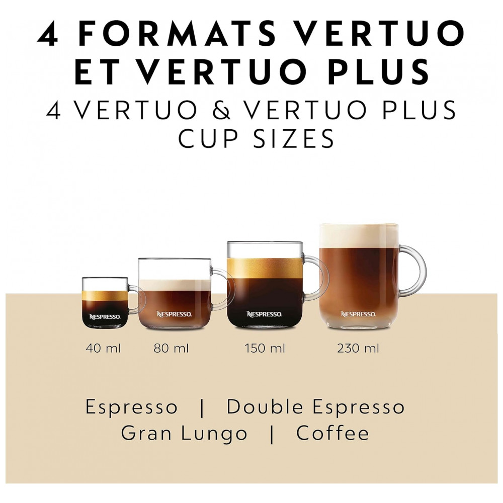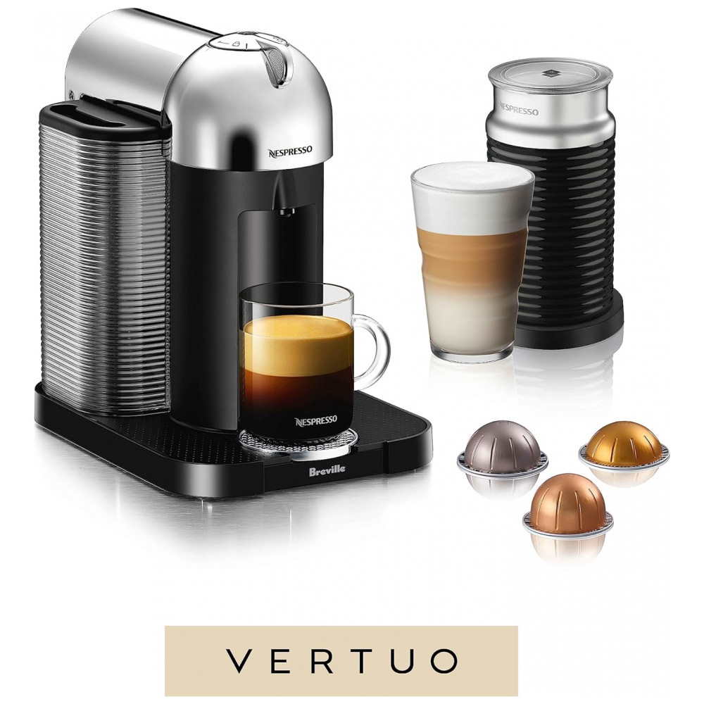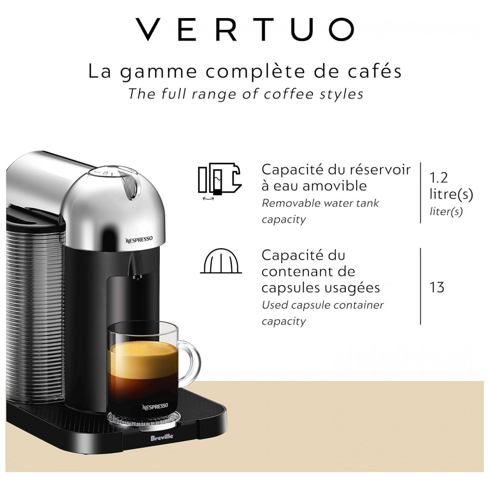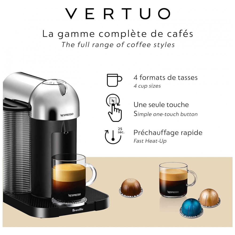 A Nespresso Vertuo usa cápsulas grandes para café e pequenas para expresso e possui tecnologia patenteada de extração Centrifusion lê o código de barras na borda de cápsulas de dose única compatíveis e define automaticamente os parâmetros de preparo