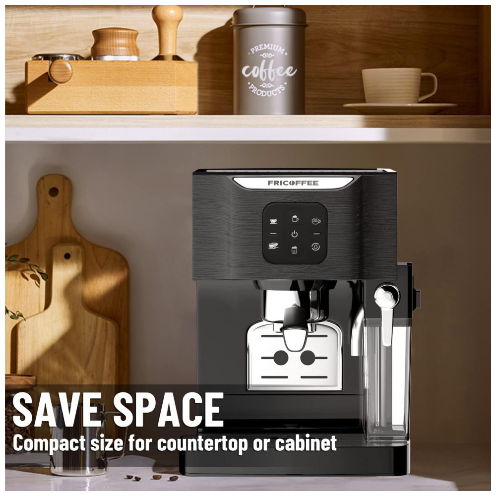 Máquina de Café Expresso Automática 20 Bar Fricoffee com Vaporizador, 110V Preta: Auto limpeza e tamanho compacto a máquina de café expresso Fricoffee é certificada pela FDA.