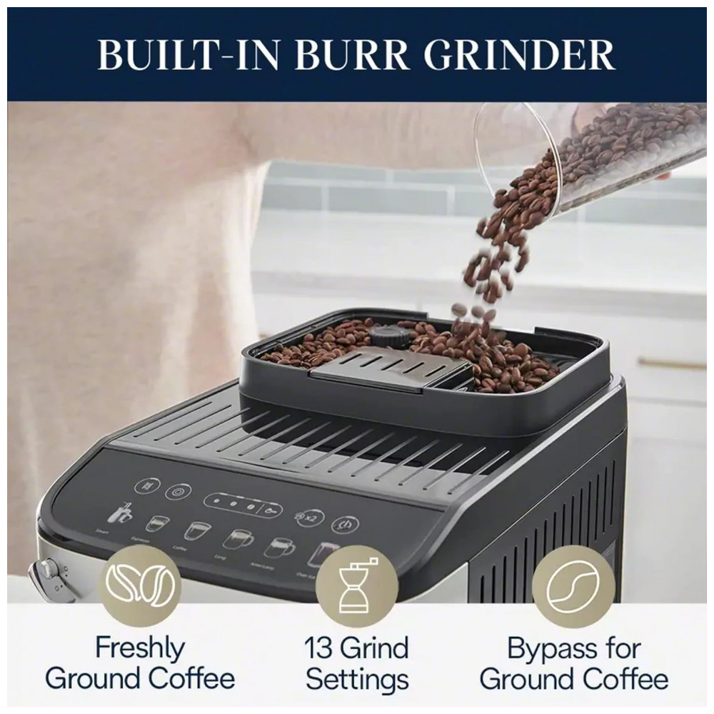 O moedor de rebarbas cônico integrado e a unidade de infusão oferecem apenas o café expresso mais fresco com uma moagem, dose e preparação perfeitas todas as vezes, para as bebidas mais ricas e aromáticas com sabor fresco do café O batedor de leite tradicional cria facilmente bebidas de café expresso com um espuma suave e sedosa de longa duração com leite ou suas alternativas favoritas de leite.