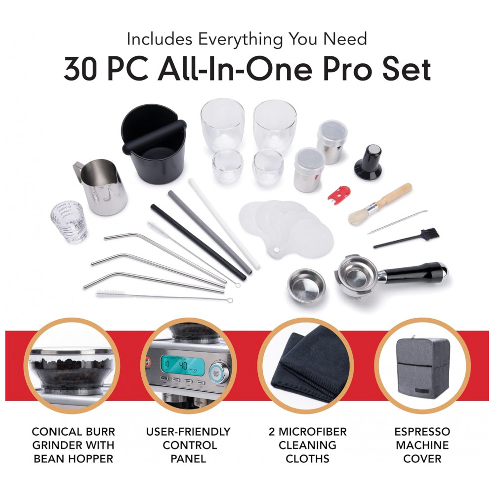 O vaporizador embutido vaporiza e espuma seu leite para deliciosos cappuccinos e lattes Conjunto de 30 peças a máquina de cappuccino vem com 29 outras peças para o seu próprio café.