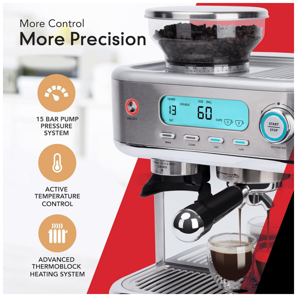 Desfrute de Espresso, Cappuccino e Latte de Grau Barista em casa com o toque de alguns botões, a Máquina Barista Pro Espresso All In One moerá grãos de café expresso, preparará uma…