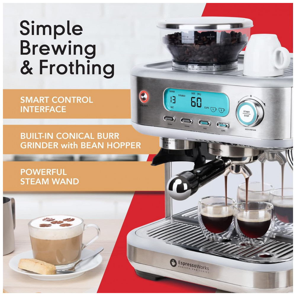 Máquina de Café Expresso EspressoWorks 15 Bar com Vaporizador Embutido, 110V 1350W Prata: Desfrute de Espresso, Cappuccino e Latte de Grau Barista em casa com o toque de alguns botões, a Máquina Barista Pro Espresso All In One moerá grãos de café expresso, preparará uma a duas doses de café expresso e vaporizará o leite por um período especificado quantidade de tempo Pronto para usar em menos de 60 segundos a máquina de café expresso de 15 barras possui um sistema de aquecimento termobloco e um painel de controle fácil de usar.