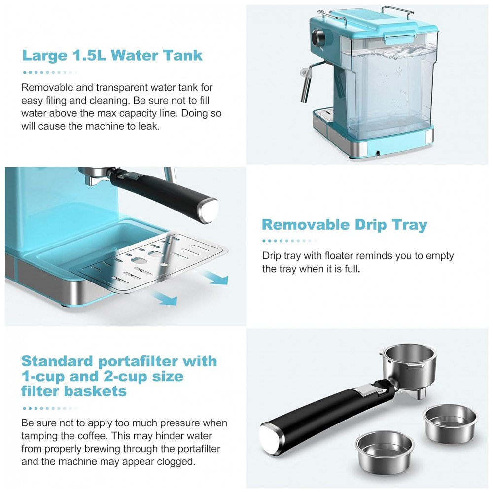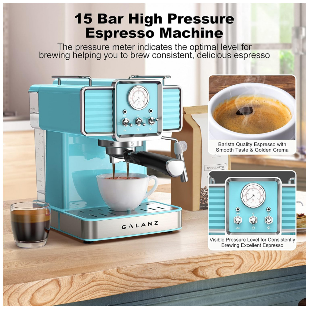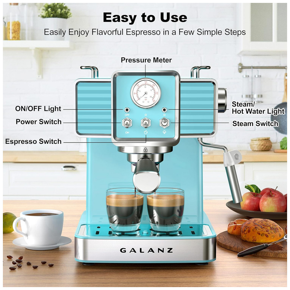 Máquina de Café Expresso Retrô 15 Bar com Bocal de Leite, 110V, Galanz, Azul: VARINHA DE VAPOR INTEGRADA Desfrute de saborosos cappuccinos, lattes e muito mais com espuma rica e cremosa em casa A poderosa varinha de vapor fácil de usar faz a espuma perfeita para suas bebidas de café 15 BAR DE ALTA PRESSÃO Espresso de qualidade barista em casa, bomba de pressão de 15 bar é o nível de pressão ideal para café expresso com sabor rico Inclui um medidor de pressão para preparar consistentemente café expresso DESIGN RETRO DIVERTIDO Tem a aparência clássica dos velhos tempos, mas com funcionalidade moderna Misture e combine com os outros utensílios de cozinha da coleção Galanz Retro.