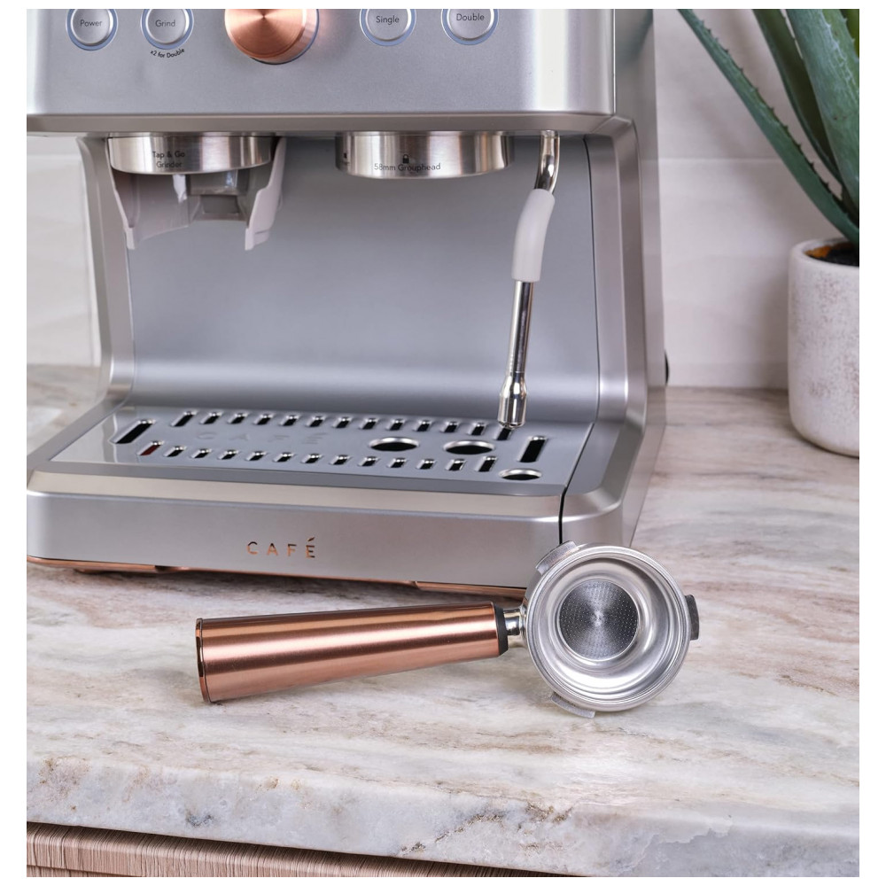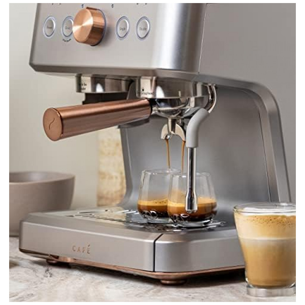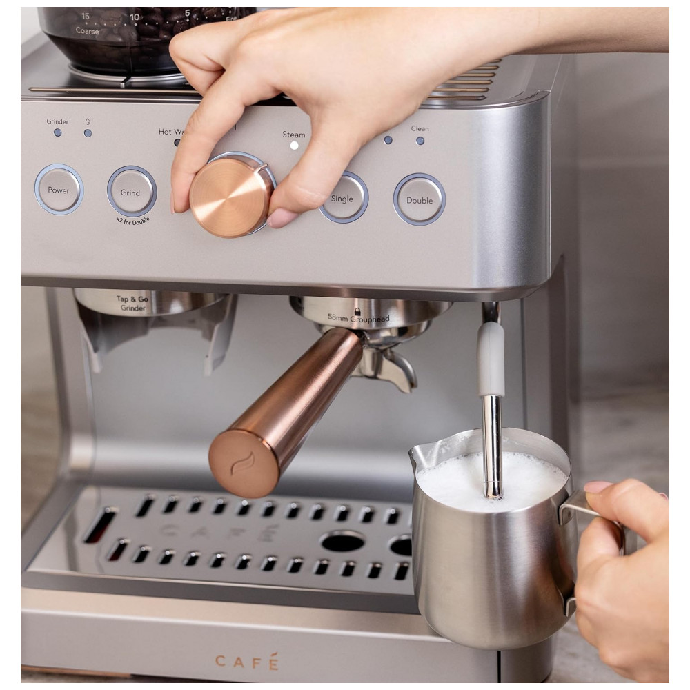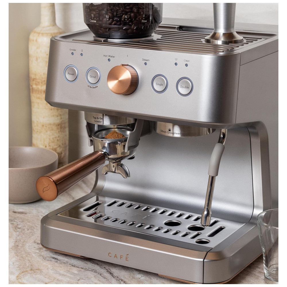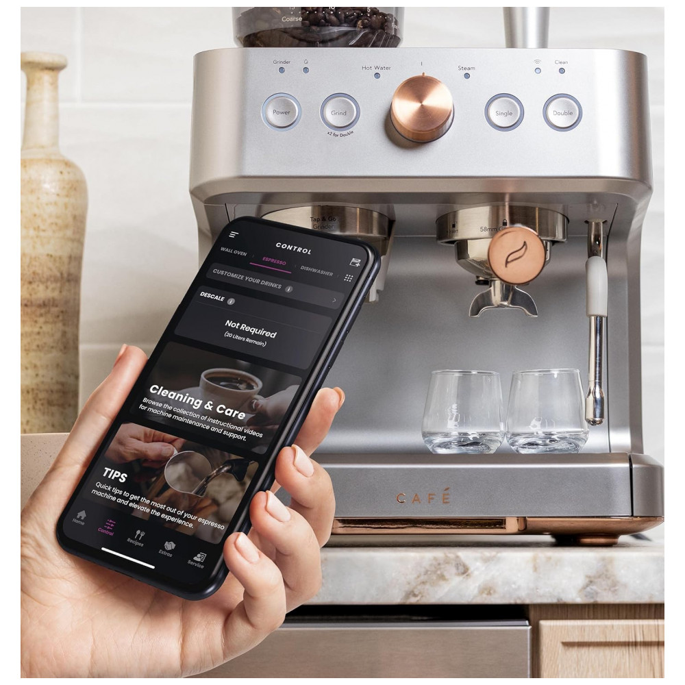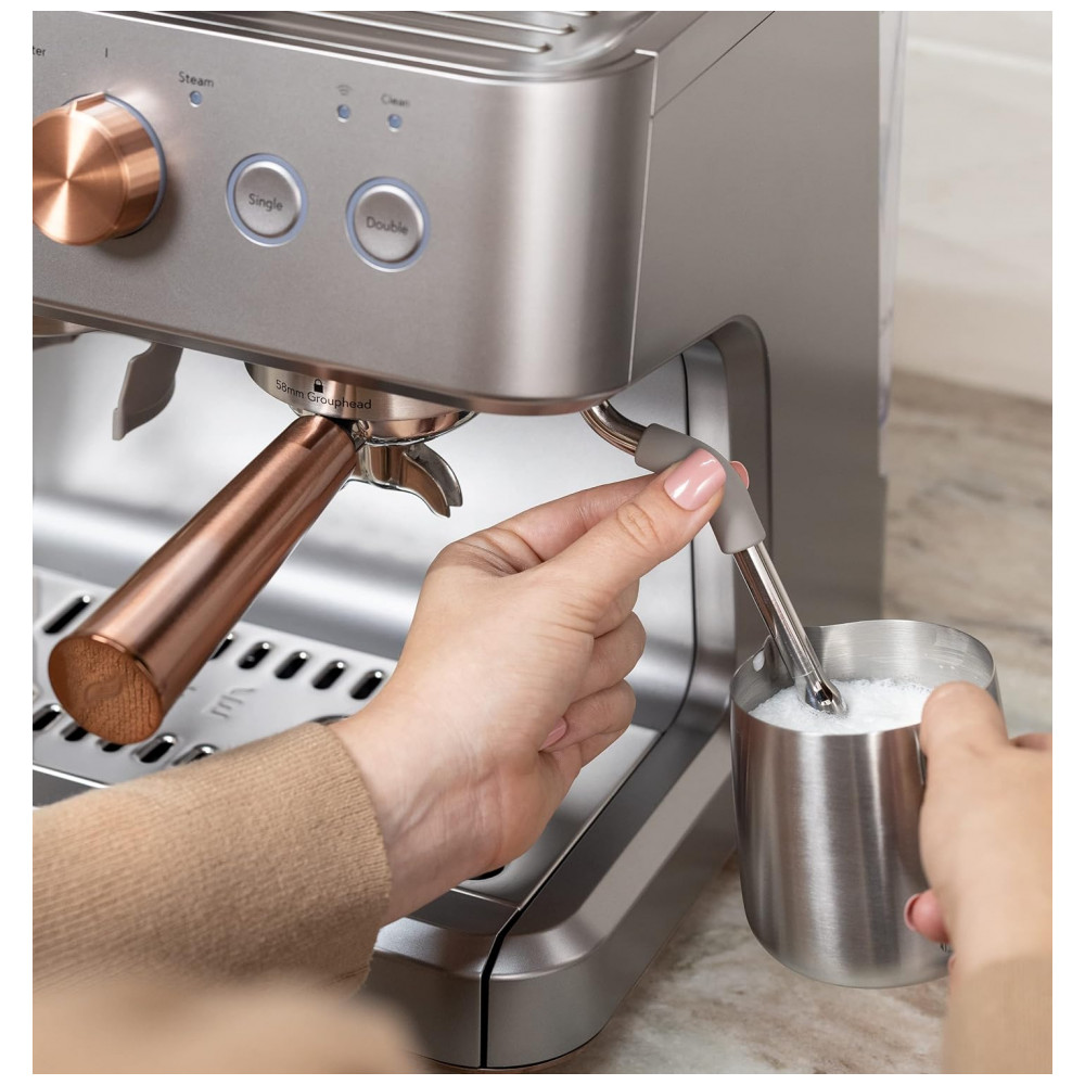 Vareta de vapor integrada que gira em um movimento de 180 graus para controle e conveniência para obter uma variedade de texturas e espessuras de microespuma para lattes, flat whites e cappuccinos Bomba italiana de 15 bar que aumenta lentamente a pressão nominal da bomba para extrair sabores Moedor de rebarbas cônico de aço inoxidável com 15 níveis de moagem Reservatório de água removível de 2,8 L Kit de limpeza incluído com um alfinete, solução de descalcificação, tira de teste de dureza da água e escova de limpeza Wi Fi conectado com tecnologia de personalização de bebidas Equipe sua cozinha com uma máquina de café expresso inteligente que sincroniza com o aplicativo SmartHQ, permitindo que os usuários personalizem as preferências de bebida por volume e força, além de permitir atualizações de software.