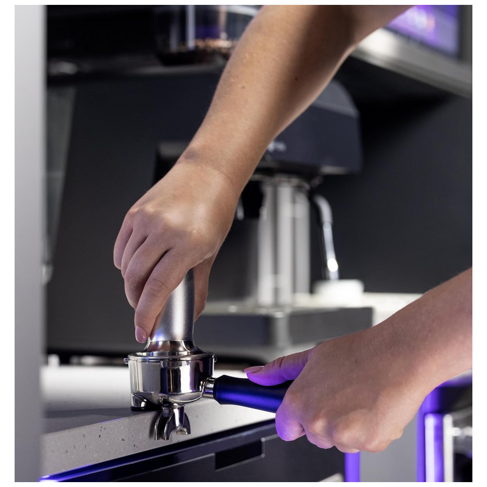 Bomba italiana de 15 bar que aumenta lentamente a pressão nominal da bomba para extrair sabores O moedor cônico de aço inoxidável oferece uma quantidade exata de pó fresco diretamente no porta filtro e, com 15 níveis de moagem, oferece a capacidade de discar um tiro perfeito A caldeira de bloco de alumínio com bobina de cobre integrada fornece 1300 watts de potência para aquecer a água de forma imediata e consistente, garantindo sempre um café expresso de qualidade Kit de limpeza incluído, aço temperado, jarro de espuma de aço inoxidável escovado e filtros de camada simples e dupla Vaporizador Obtenha uma variedade de texturas e espessuras de microespuma para lattes, flat whites, cappuccinos e muito mais com uma varinha de vapor integrada que gira em um movimento de 180 graus para controle e conveniência.