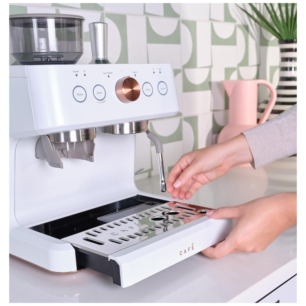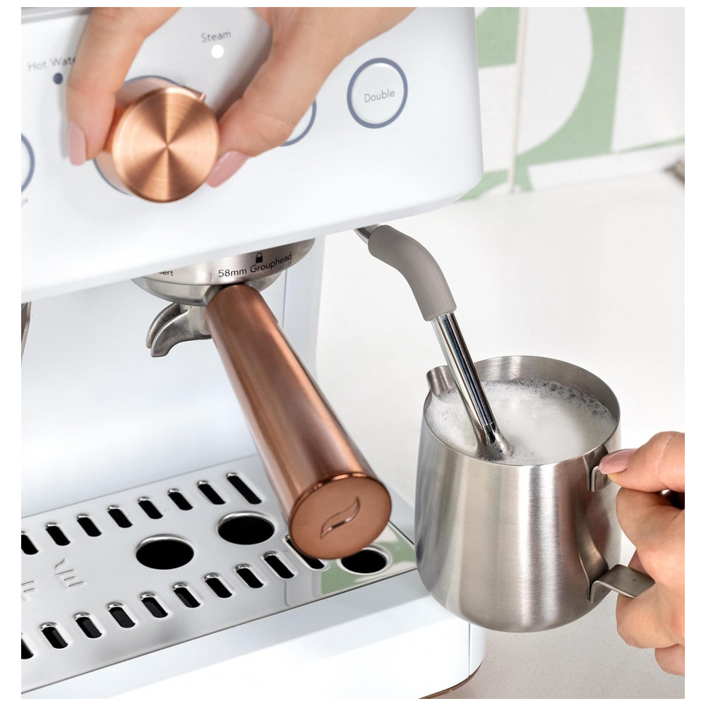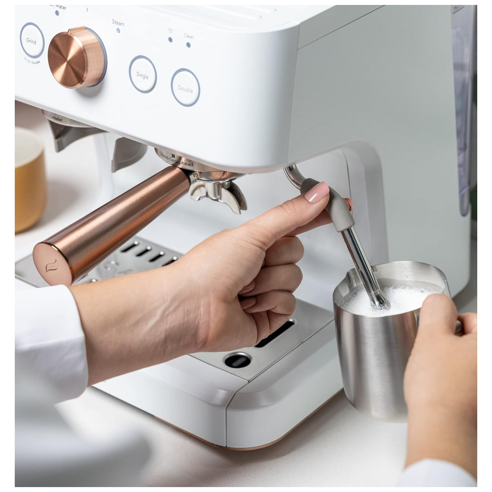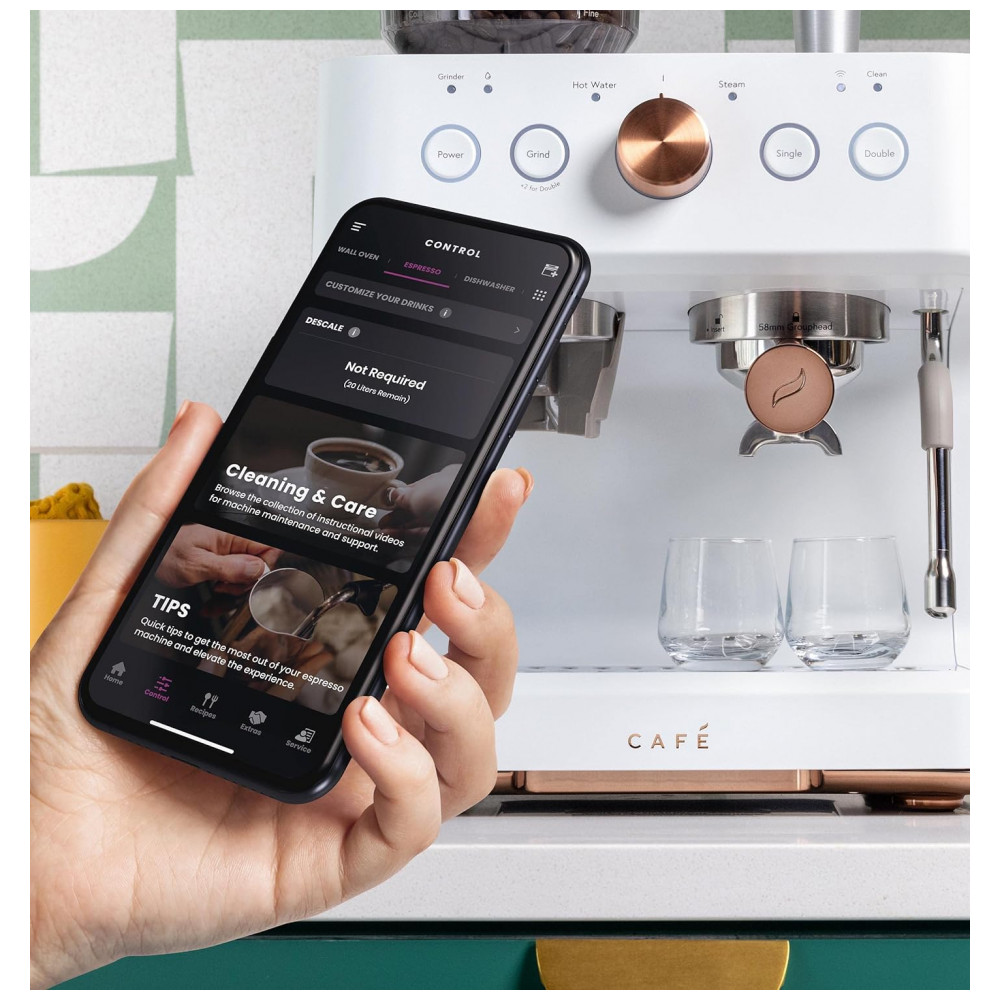 Máquina de Café Expresso Semi Automática CAFÉ 15 Bar com Espumador de Leite e Wi Fi, 110V Branca: WIFI CONECTADO COM TECNOLOGIA DE PERSONALIZAÇÃO DE BEBIDAS Equipe sua cozinha com uma máquina de café expresso inteligente que sincroniza com o aplicativo SmartHQ, permitindo que os usuários personalizem as preferências de bebida por volume e força, além de permitir atualizações de software ITALIAN MADE, 15 BAR PUMP Esta bomba de barra aumenta lentamente a pressão nominal da bomba para extrair o máximo de sabor, proporcionando uma xícara de café expresso lindamente equilibrada.
