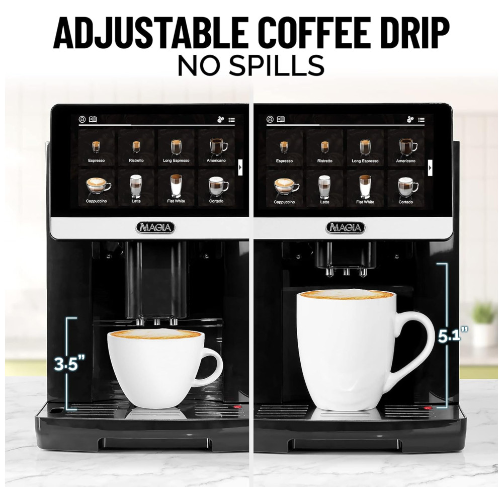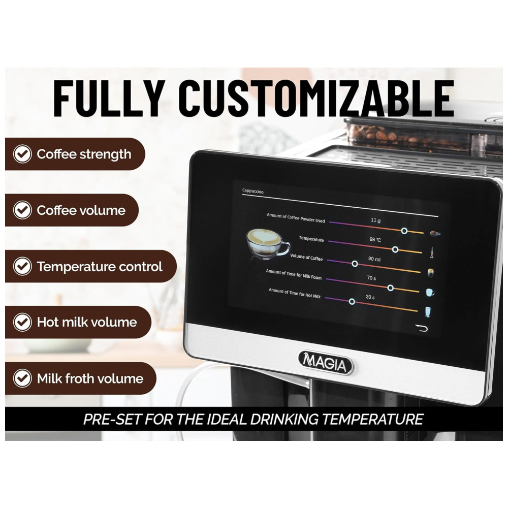 Este fabricante de espresso único é projetado com uma variedade de 20 receitas de café diferentes, servindo sempre com um copo de perfeição Escolha facilmente entre lattes, cappuccinos, americanos, espresso, brancos planos, macchiatos e muitos, muitos mais Tudo exatamente do jeito que você quer OPERAÇÃO SEM STRESS E SEM STRESS A máquina de espresso super automática Magia foi projetada especialmente com uma ampla variedade de funções e recursos incríveis, como uma bomba italiana de 19 bar, Tela sensível ao toque de alta resolução de 7 polegadas, recipiente de zenamento de feijão de 8,8 oz, tanque de capacidade de água de 1800 ml, placa mais quente para copos e 18 receitas especiais de café pré carregadas.