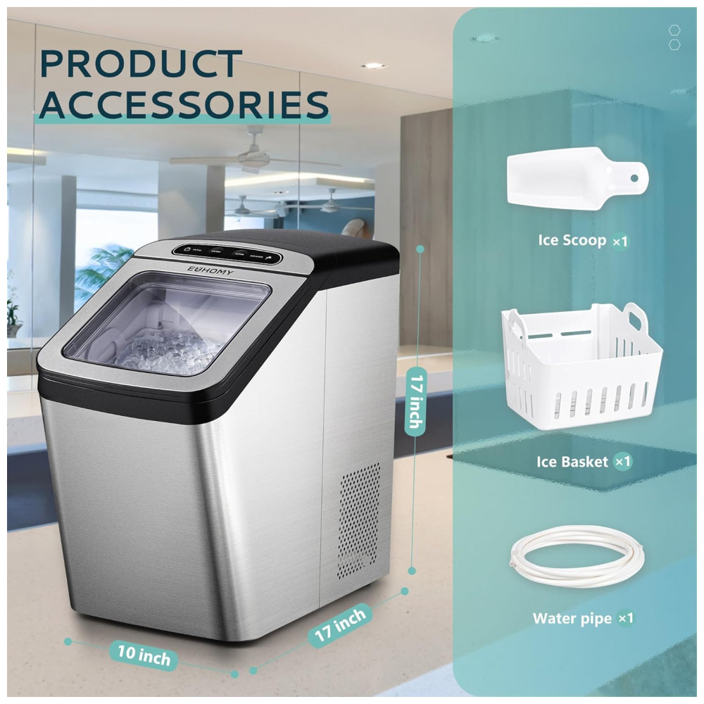 Máquina de Gelo Automática Capacidade 2.7L, Aço Inoxidável com Painel de Controle, 170W, 110v, E EUHOMY, Prateado