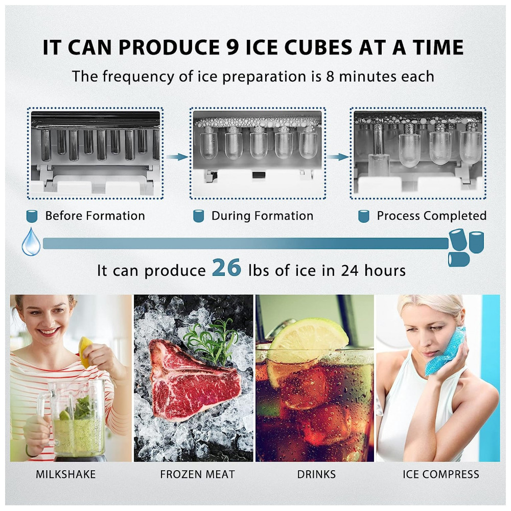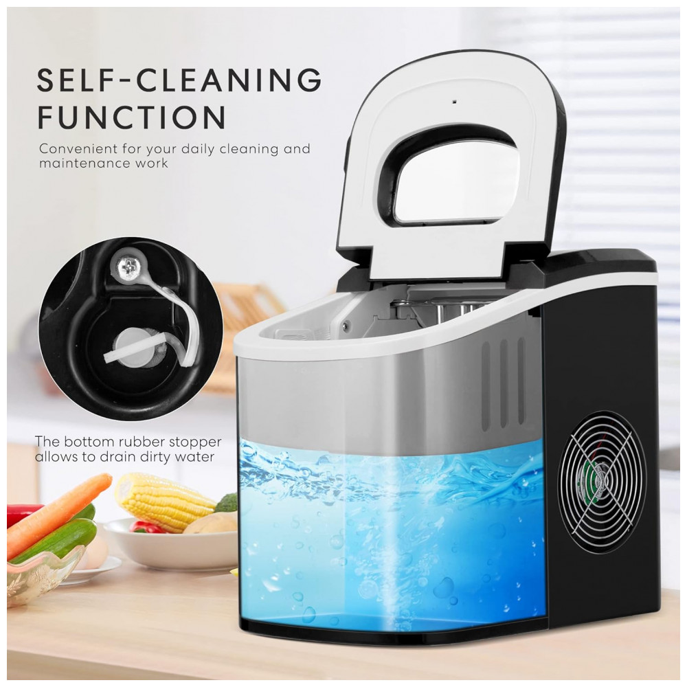 ACABAMENTO RÁPIDO Basta conectar a energia, adicionar água e desfrutar de uma fornada de gelo em cerca de 6 a 10 minutos A máquina pode fazer até 26 libras de cubos de gelo em 24 horas Obtenha cubos de gelo em menos tempo do que comprá los na loja FÁCIL DE OPERAR Não requer instalação Ligue , desligue a máquina e selecione o tamanho do gelo S , L de acordo com sua preferência, tudo no painel de controle Com proteção automática contra estouro, você nunca mais terá que lidar com a bagunça nas bandejas de gelo MONITORAMENTO TOTAL Projetado com sistema de refrigeração do compressor, que opera com baixo ruído e não atrapalha sua vida normal A janela transparente no topo ajuda a monitorar o processo e verificar o nível de gelo INDICADOR DE LUZ Quando o nível da água estiver em 2,3 litros, o que significa que o reservatório está baixo, o indicador vermelho irá alertá lo para adicionar mais água Quando o balde de gelo estiver cheio, outro indicador irá alertá lo para removê los para que mais gelo possa ser feito