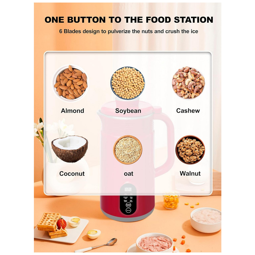 Com lâminas de 6 folhas para quebrar as nozes cruas e obter os nutrientes em segundos, a máquina de leite vegano possui um design portátil e conveniente para uso em casa.