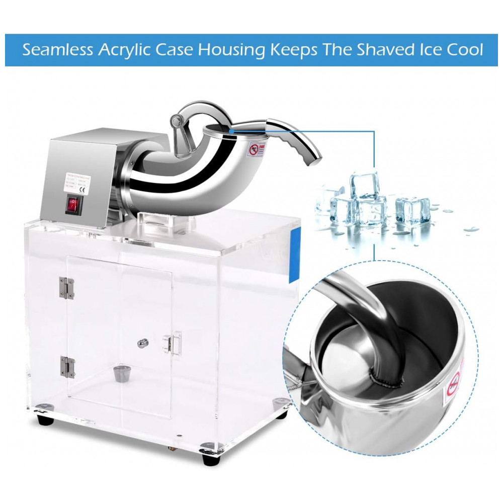 Construção robusta construída para durar Construída com 201 corpo de máquina de aço inoxidável, 430 lâminas de aço inoxidável e recipiente de acrílico espesso, esta máquina de cone de neve apresenta afiação, altamente transparente e inquebrável, pode suportar muitos anos de uso.