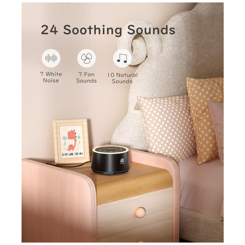 Esta máquina de ruído do sono tem 24 sons suaves para escolher, incluindo ruído branco, ruído rosa, ruído marrom, ruído do ventilador de luz ao profundo, ondas do mar, chuva, canção de ninar do bebê, chuva, fogueira e outros sons da natureza máquina de ruído eletro adequada para crianças.