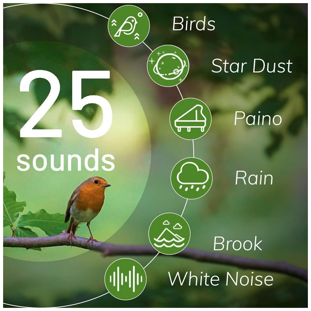 25 sons suaves esta máquina de ruído branco tem 4 sons de branco branco, marrom, rosa, azul, 4 sons de ventilador, 17 sons relaxantes chuva, riacho, ondas do mar, pássaros, piano,…