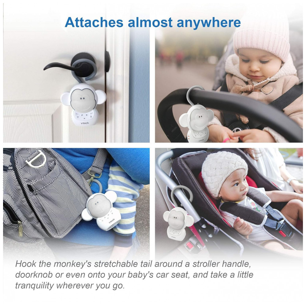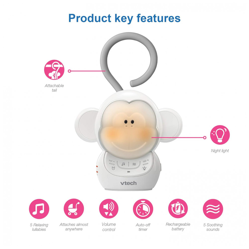 Máquina de Som Ruído para Bebês Recém Nascidos com Luzes, Macaco, VTECH BC8211, Branco: Cinco melodias calmantes e cinco sons ambientes suaves, incluindo um fluxo gotejante e ruído branco, ajudam o bebê a cair em um sono doce.