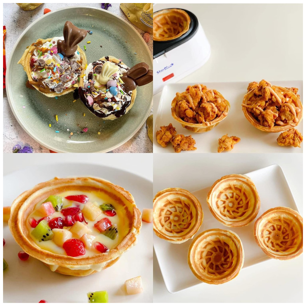 Crie tigelas grossas de waffle para suas coberturas favoritas Frutas, saladas, misturas salgadas, sorvetes, não importa o que você queira como coberturas, você pode contar com as tigelas de waffle criadas usando o fabricante de tigela dupla de waffle Para zenar tudo juntos sem criar uma bagunça encharcada.