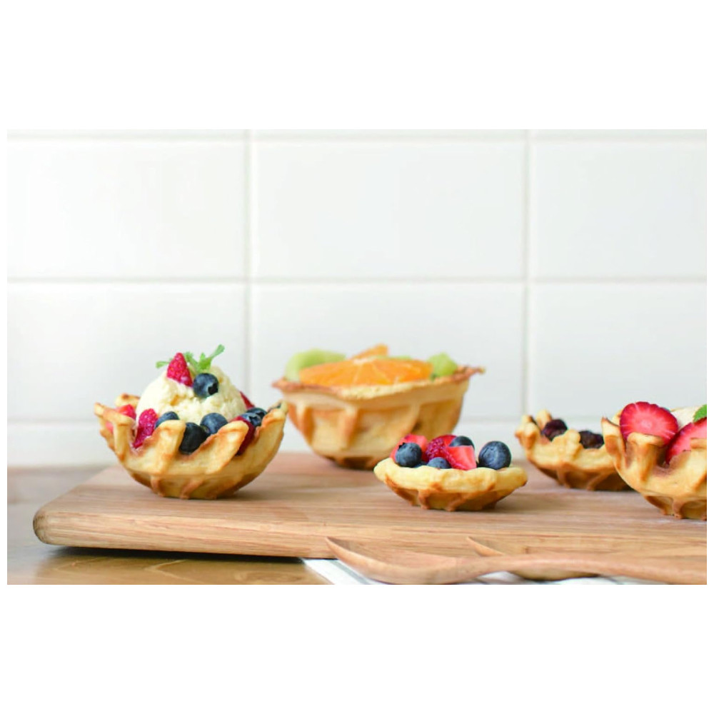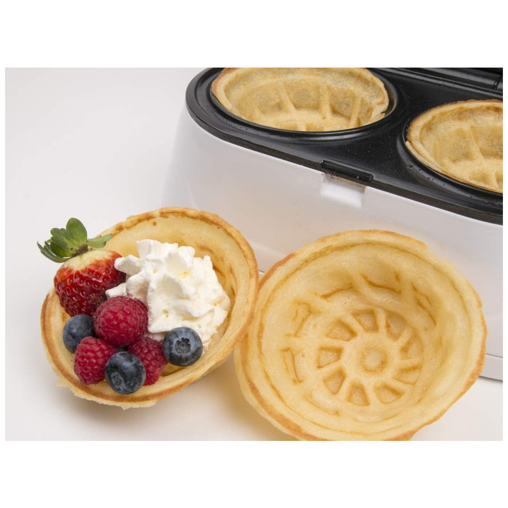Isso mesmo uma tigela que é literalmente comestível Adicione suas coberturas favoritas e você terá uma obra prima da culinária instantânea Crie duas tigelas de waffle ao mesmo tempo Fique mais eficiente na cozinha Com dois moldes antiaderentes para as tigelas, você pode dobrar o processo de criação de suas deliciosas guloseimas de waffle O diâmetro da tigela de waffle é 9,.