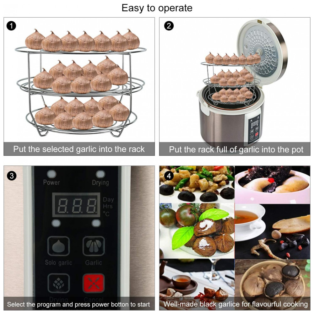 Equipado com um sistema de círculo de umidade e convecção de ar quente de 360 graus inteligente para garantir um alho preto perfeito.