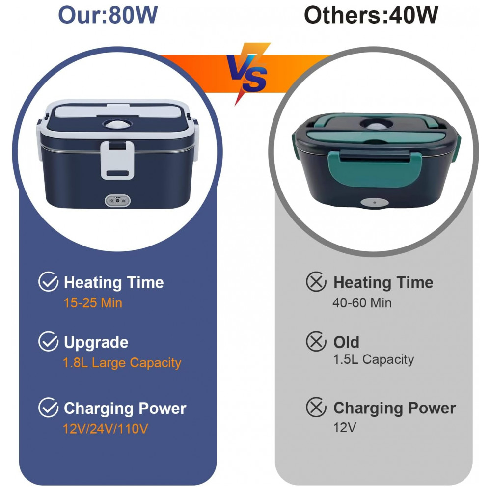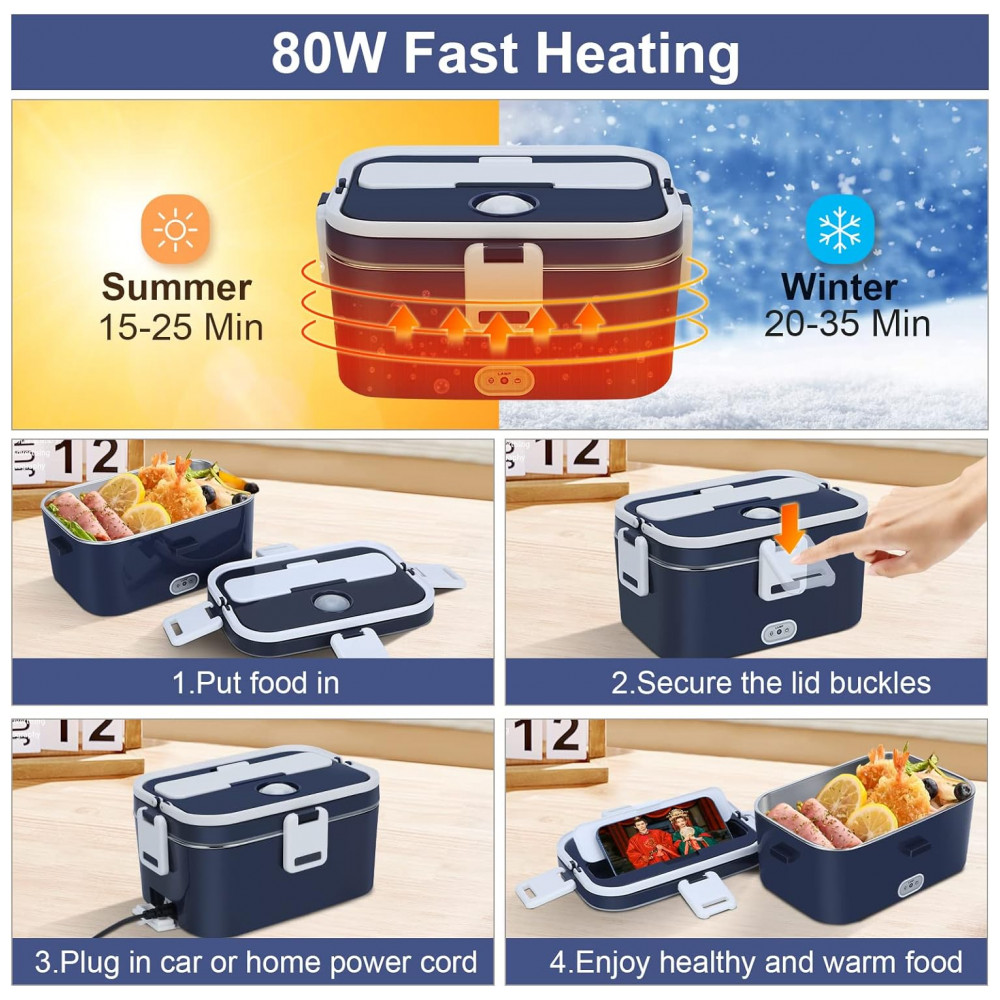 Marmita Elétrica Portátil 1,8L com Acessórios e 2 Fontes de Alimentação 12V ou 110V, 80W, COZYEXPERT, Azul Royal e Branco: A lancheira elétrica 3 em 1 é a solução perfeita para quem deseja desfrutar de refeições quentes e saudáveis a qualquer hora e em qualquer lugar.