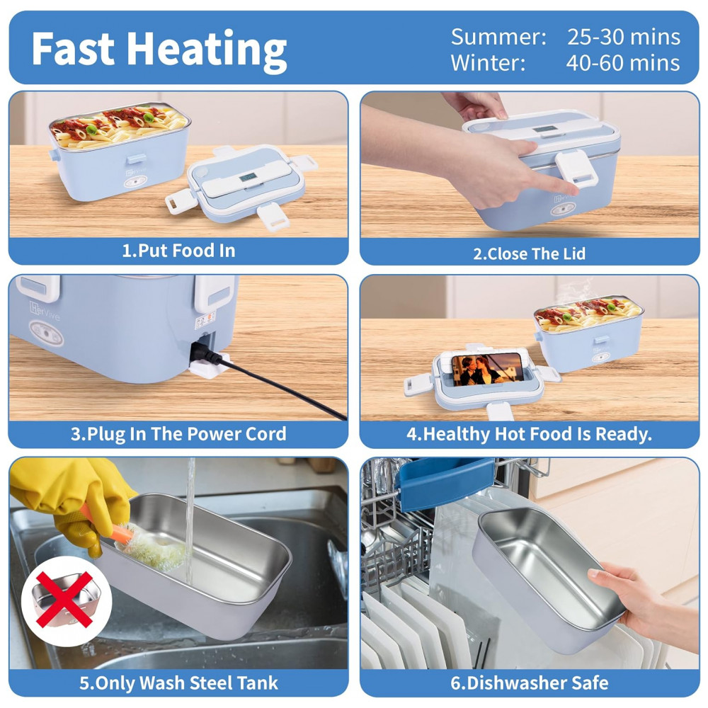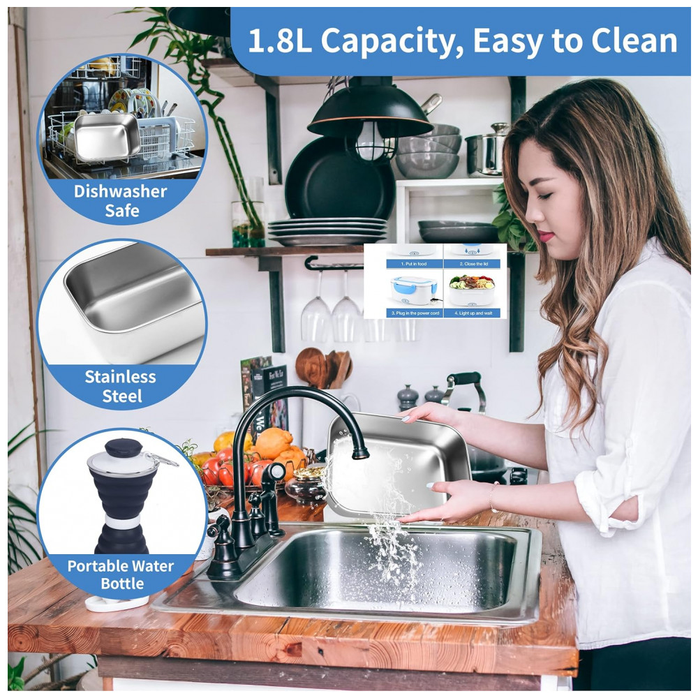 Marmita Elétrica Portátil 1,8L com Garrafa de Água Dobrável, Cesta e à Prova de Vazamentos, 12V ou 110V, HerVive, Azul e Branco: A lancheira térmica elétrica é uma ótima opção para quem deseja manter a comida quente e fresca enquanto está fora de casa.