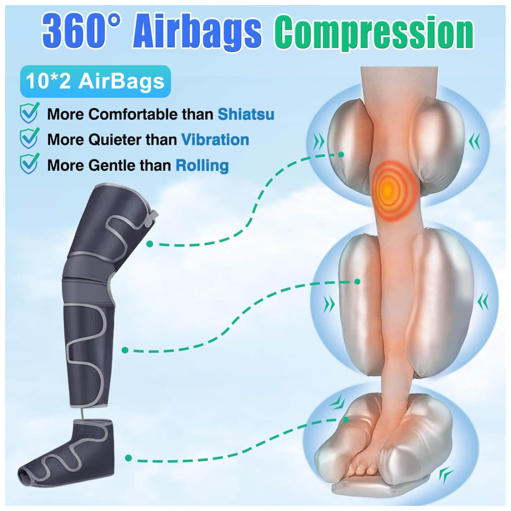 4 Modos 4 Intensidades e 2 Níveis de Calor O massageador de pés e pernas vem com 4 modos e 4 intensidades Baixo, Médio, Médio Alto, Alto, possui uma função de aquecimento opcional de 2 níveis Baixo, Alto no joelho para promovendo a circulação, também pode desligá lo separadamente.
