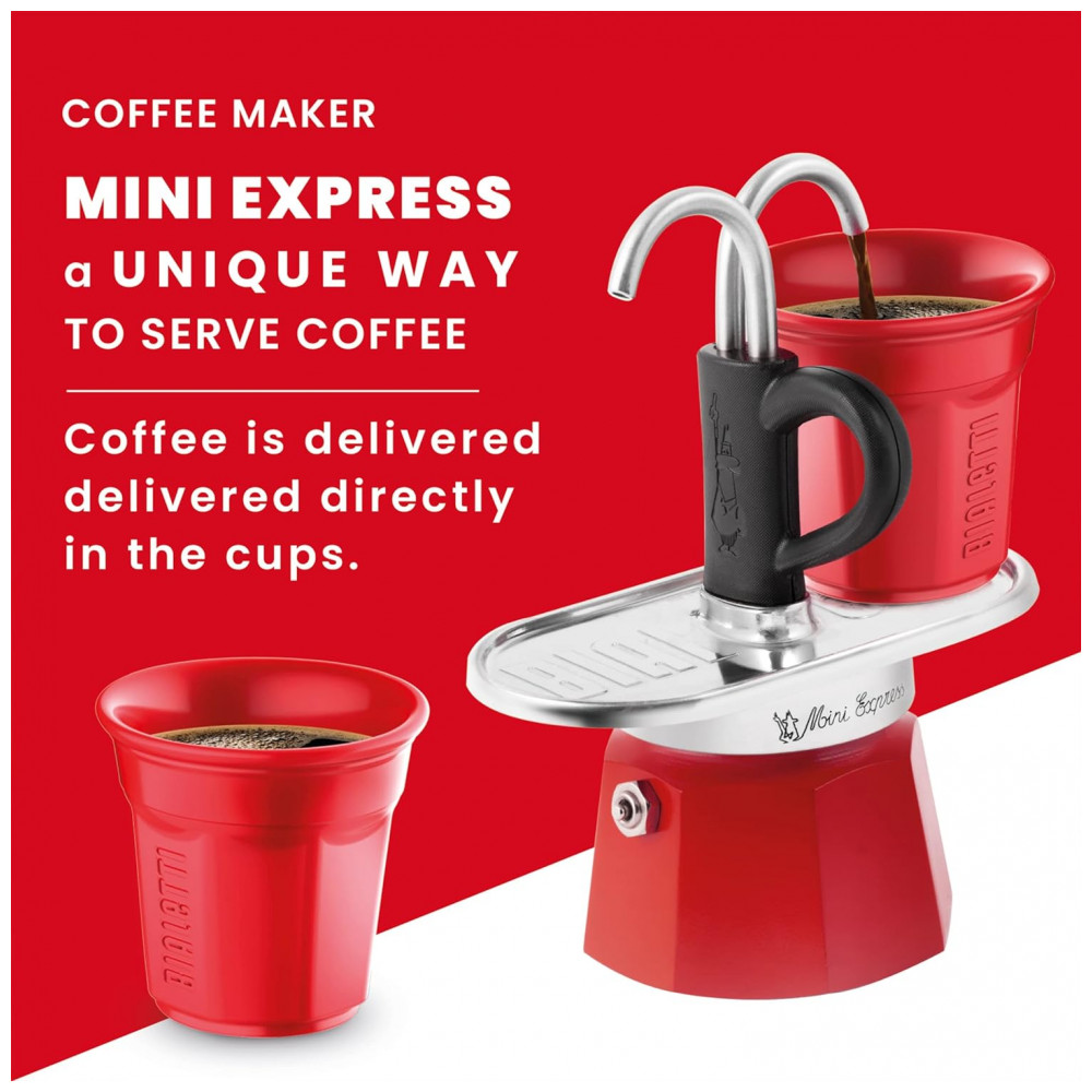 Mini Cafeteira de Café Expresso Manual Italiana 2 Xícaras, Bialetti, Vermelha: Mini Express é a melhor combinação de criatividade e inovação, entregando um expresso italiano perfeito diretamente nas xícaras Este inconfundível Bialetti Mini Express vermelho apresenta uma placa de suporte e duas xícaras de café expresso da marca Bialetti combinando Como usar Bialetti Mini Express encha a caldeira com água até o nível da válvula, encha a cesta com café e aperte bem a parte superior o café será distribuído diretamente nas xícaras embutidas, apoiado em uma placa de alumínio especial que aquece durante a preparação O tamanho do Bialetti Mini Express é medido em xícaras de café expresso, o café pode ser apreciado em xícaras de café expresso 2 incluídas Instruções de limpeza Bialetti Mini Express deve ser limpo apenas enxaguando todos os componentes com água simples, não use detergente nem coloque na máquina de lavar louça, pois danifica o produto e o sabor do seu café