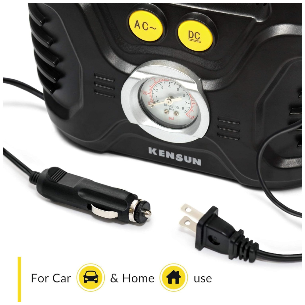 AC , DC PARA CARRO E CASA A comutação AC , DC exclusiva da Kensun com plugue de luz de cigarro de carro de 12 V, bem como plugue de parede de 110 V para tomada doméstica, torna este inflador mais útil, pois você pode usá lo em qualquer lugar.