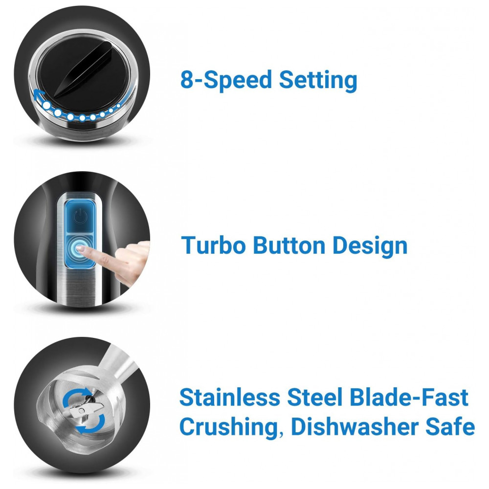 O liquidificador de imersão manual está equipado com um motor potente de 500 W, controle simples de velocidade dupla de 2 botões, dispositivos de controle ajustáveis de 8 velocidad…