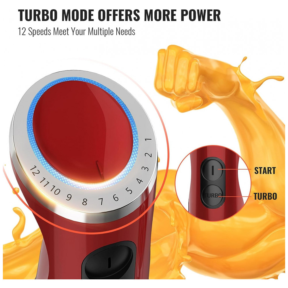 Mixer 4 em 1 Multifuncional com 12 Velocidades e Acessórios, 800W, 110v, KOIOS HB 2046, Vermelho: Design ergonômico Apresenta predefinições de mistura de 12 velocidades e uma função de pulso para rajadas intermitentes.
