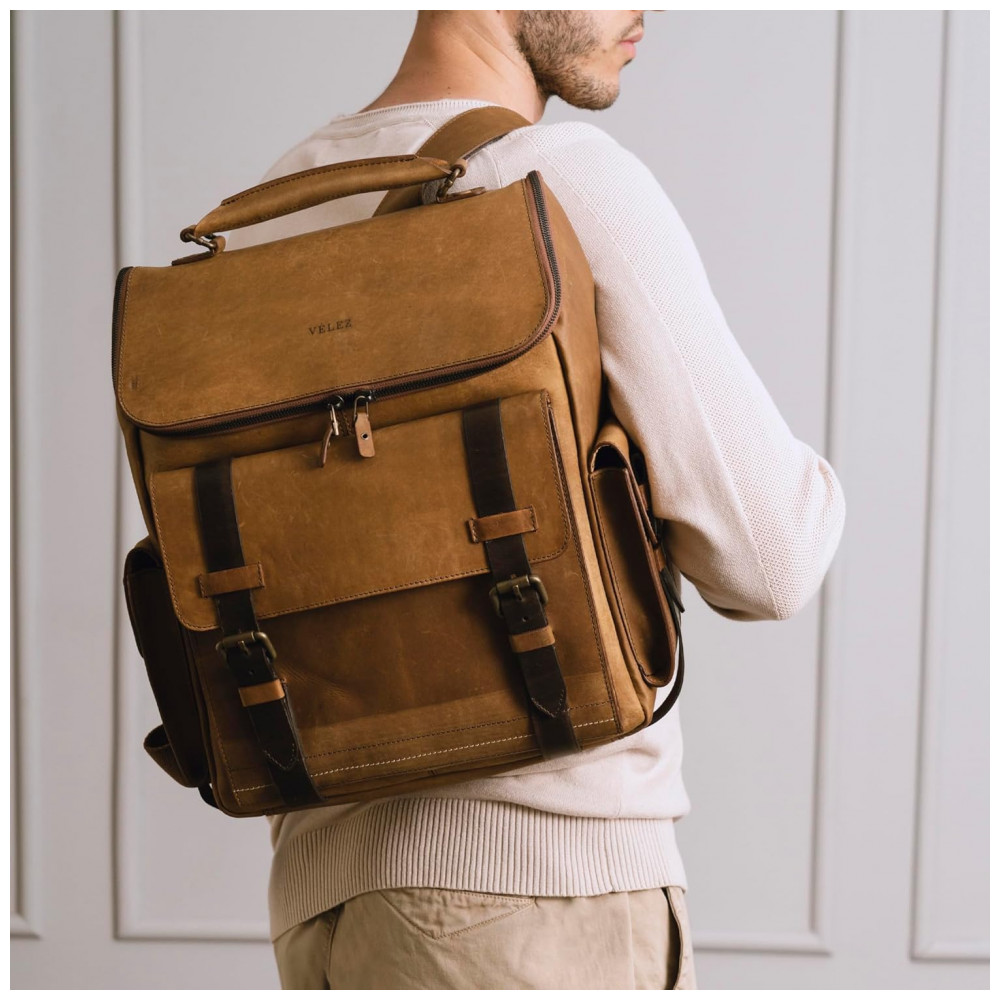 COURO DURADOURO E DE ALTA QUALIDADE Esta incrível mochila de viagem fina para homem é feita com materiais extremamente duráveis com o processo artesanal que distingue a Velez em to…