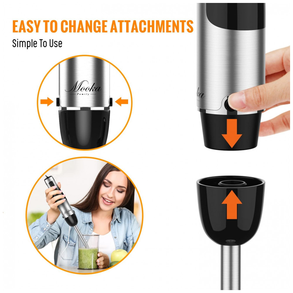 MOOKA FAMILY Mixer com 12 Velocidades e Acessórios, Aço Inoxidável, 1100W, 110V, Preto: Multifuncional 5 em 1 O conjunto de varinha de imersão inclui o corpo principal da varinha, copo de mistura de 600 ml, processador de alimentos de 500 ml, batedor e batedor de leite.