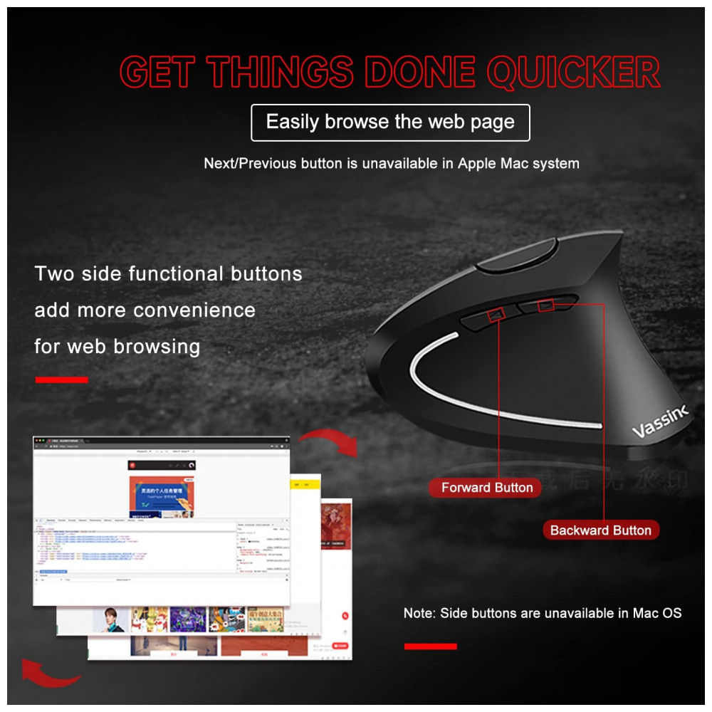Mouse Ergonômico Vertical Óptico sem Fio Reduz a Tensão do Pulso Multifunções, 800, 1600 DPI, VASSINK, Preto: Mouse sem fio ergonômico O mouse ergonômico sem fio vertical foi projetado para se ajustar ao tamanho e ao contorno da palma da mão, reduzindo a pressão na palma da mão e tornando o controle dos mouses sem fio mais confortável e natural.
