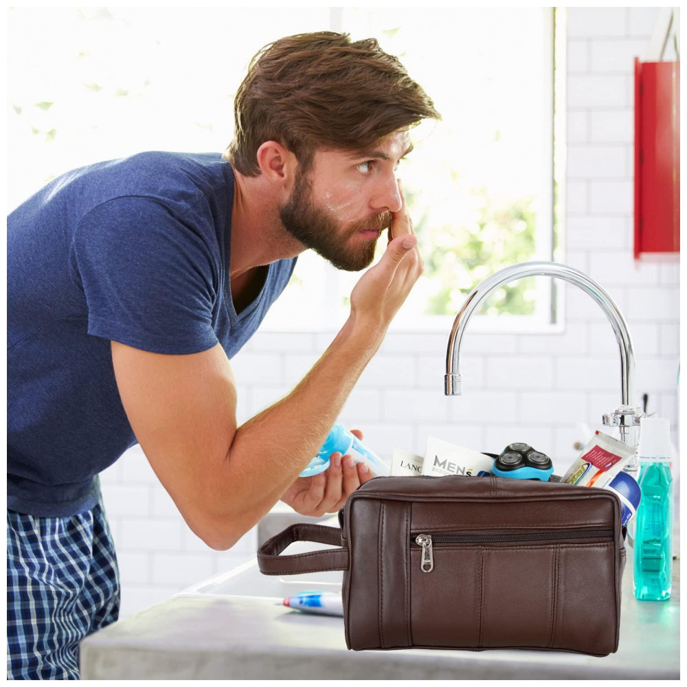 Este luxuoso produto de couro é focado no consumidor e fornece uma sensação resistente, macia e suave ao toque MÚLTIPLOS COMPARTIMENTOS Esta luxuosa bolsa de viagem possui um bolso principal com zíper na parte superior, que é um grande espaço para seus itens maiores, bem como dois bolsos laterais com zíper em cada lado para fornecer uma aparência elegante EMBALAGEM COMPACTA O design elegante deste kit dopp é perfeito para embalar confortavelmente com seus outros pertences.