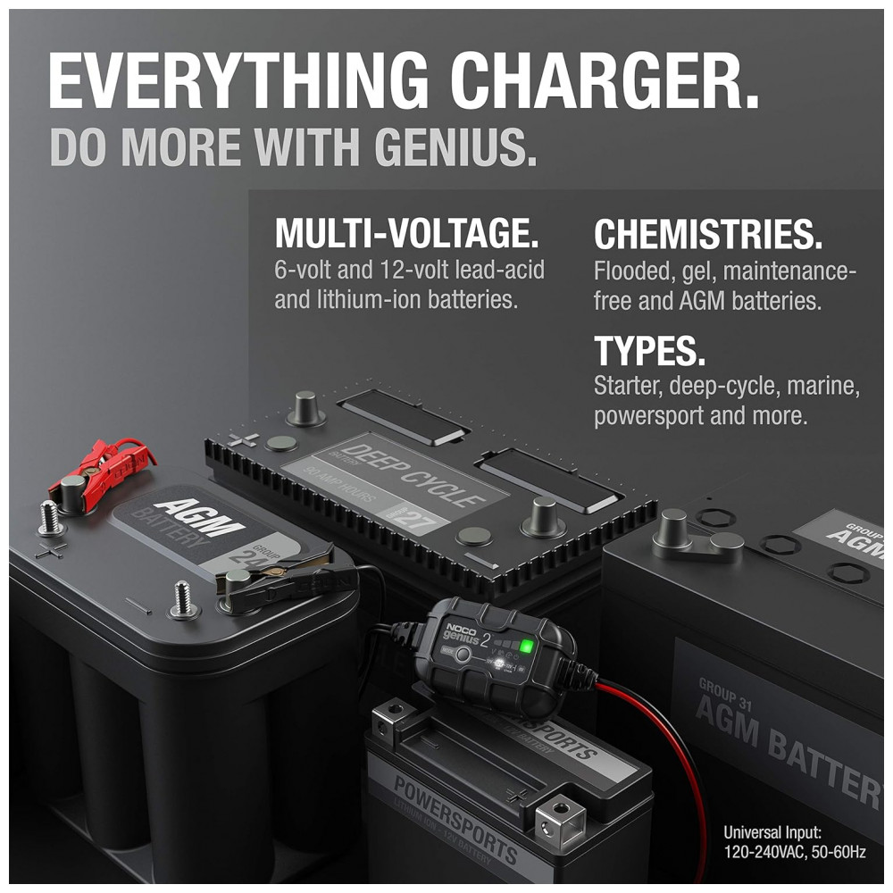 Faça mais com o Genius Projetado para baterias de chumbo ácido automotivas, marítimas e de ciclo profundo de 6 volts e 12 volts, incluindo baterias de gel, AGM e sem manutenção, além de baterias de íon de lítio.