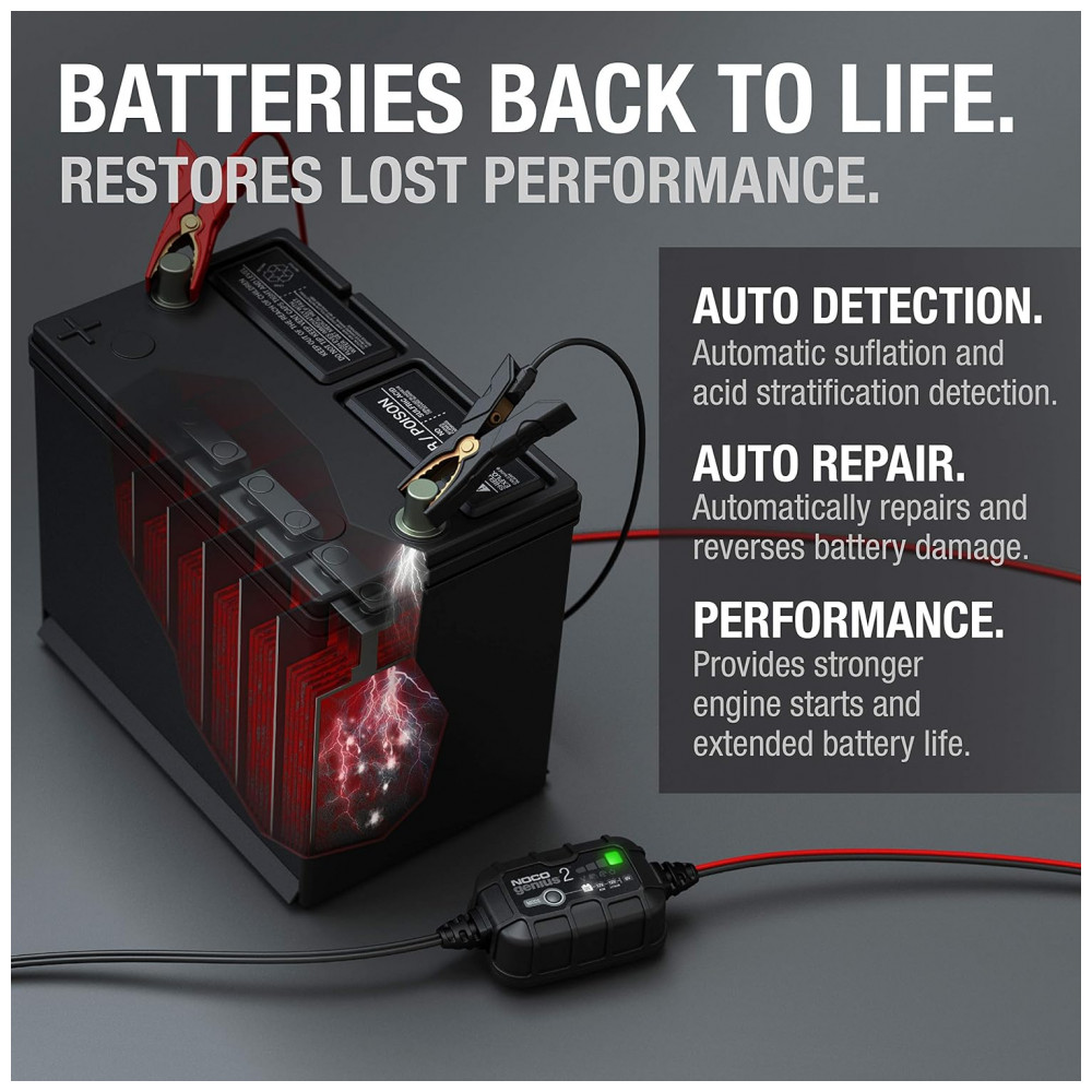 Restaure sua bateria detecta automaticamente a sulfatação da bateria e a estratificação de ácido para restaurar o desempenho da bateria perdida para partidas mais fortes do motor e vida útil prolongada da bateria.