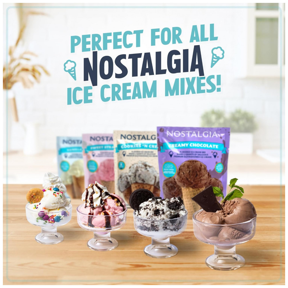 Nostalgia Máquina de Sorvete Elétrica Retro 2L de Capacidade com Triturador, 110V, Azul: CAPACIDADE A sorveteira Nostalgia tem um grande balde destacável para até 2 litros de sorvete, iogurte congelado ou sorvete de cada vez, perfeito para noites em família ou festas DESIGN DURÁVEL O motor elétrico durável de tração inferior faz toda a agitação sem necessidade de esforço manual.