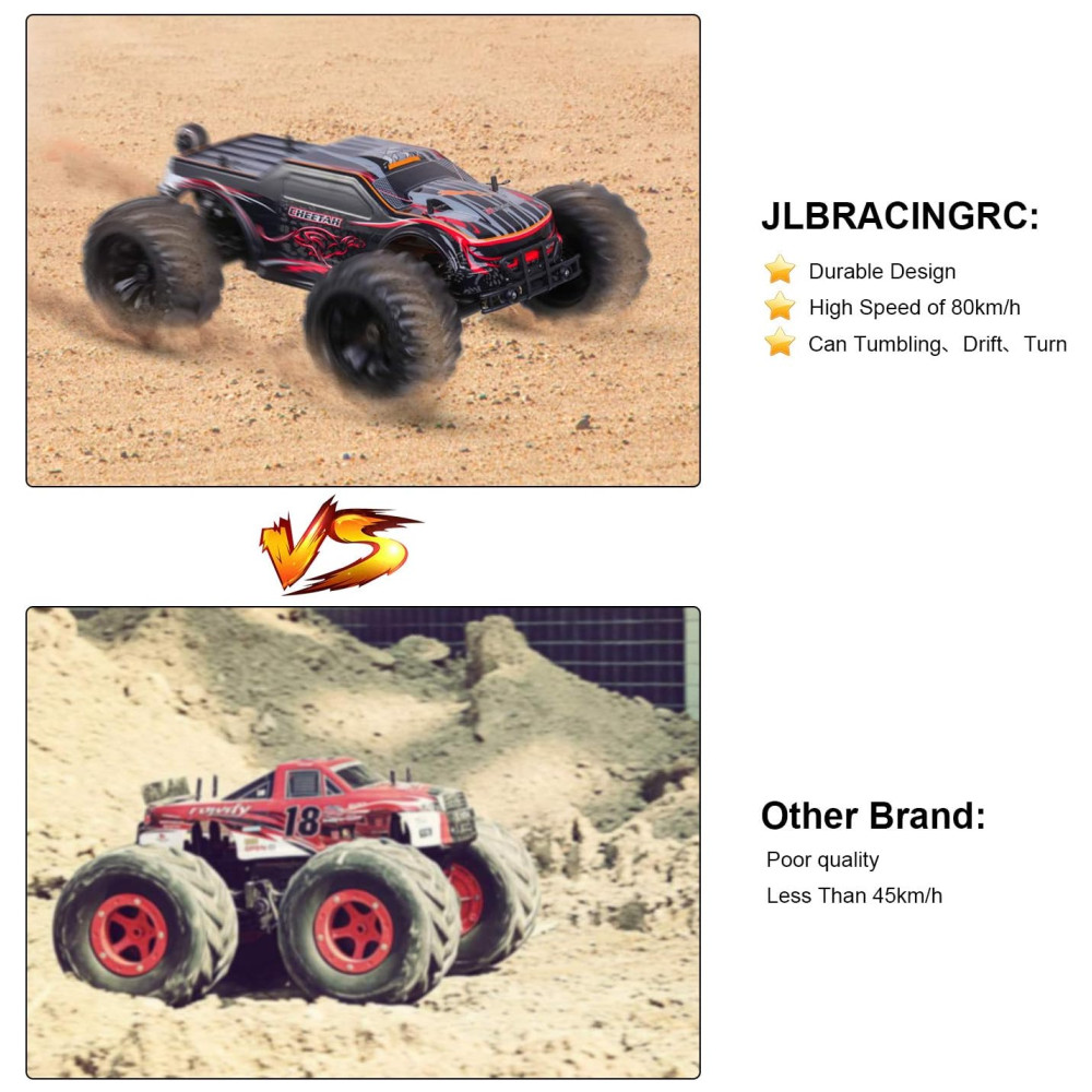 Off Road, Escala110 2.4GHZ, Controle Remoto, Adultos, Crianças, Preto: Surpreendentemente rápido 80 km , h com tração nas quatro rodas Equipado com o poderoso motor sem escova 3670 2500KV e com o ESC sem escova HOBBYWING 120A, permitindo alcançar a velocidade mais alta de 80 km , h 49,7 mph sem nenhuma dificuldade.