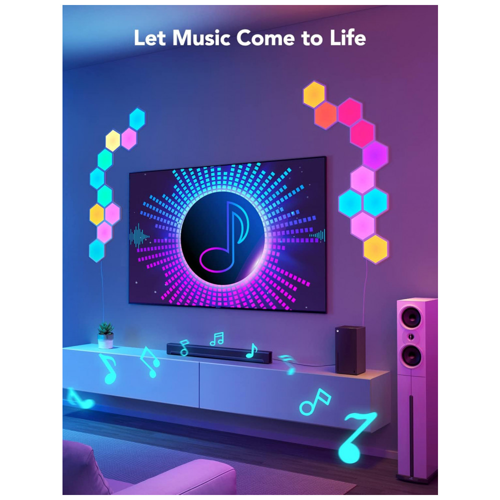O design translúcido da concha traseira pode brilhar na parede para criar camadas extras de luz para a decoração do quarto Visualize suas músicas 6 tipos de modos de sincronização de música fazem com que todos os painéis de luzes dancem ao ritmo.