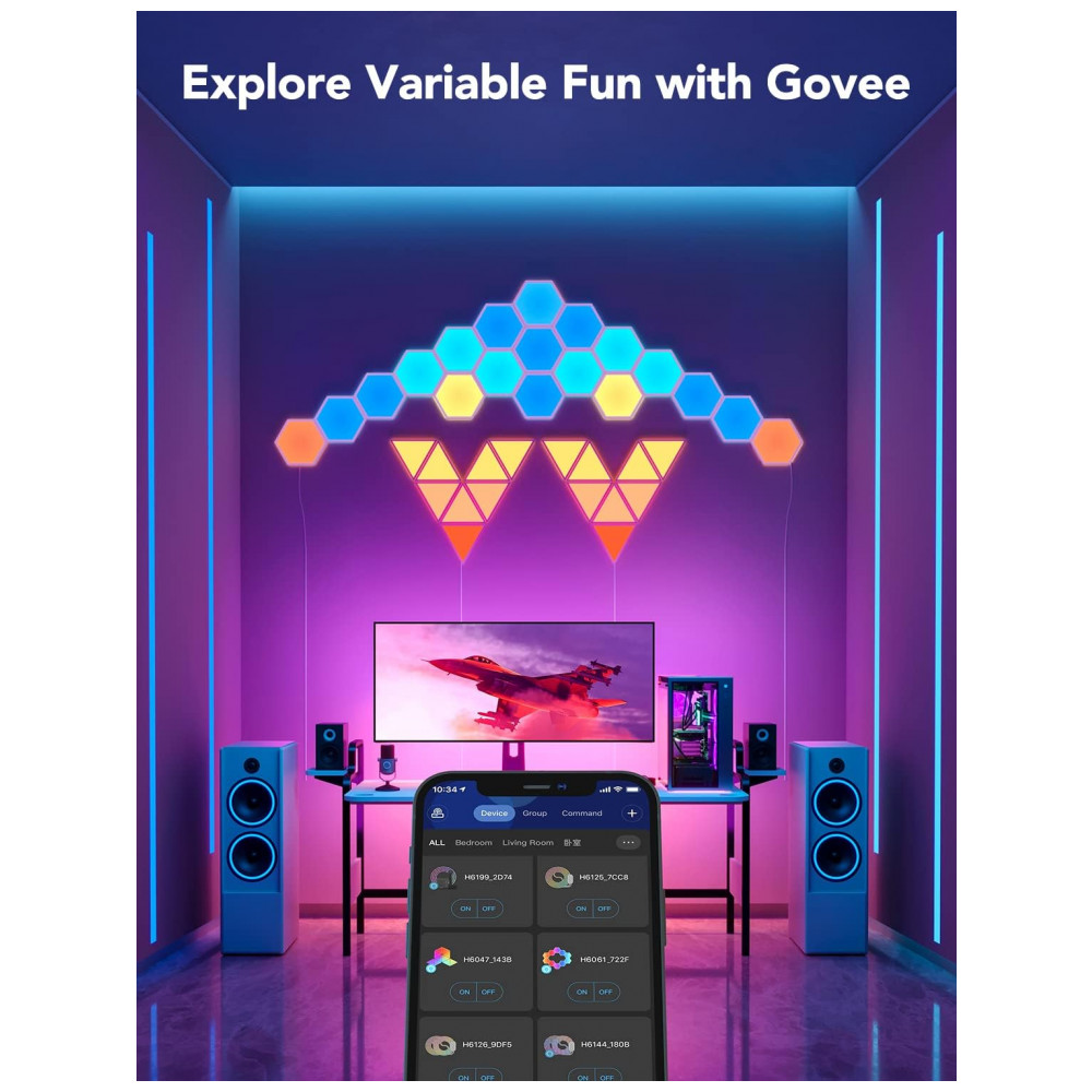 Govee Home App reconhece de forma inteligente a posição das luzes hexagonais para efeitos de arco íris fluindo perfeitamente em todo o seu design.