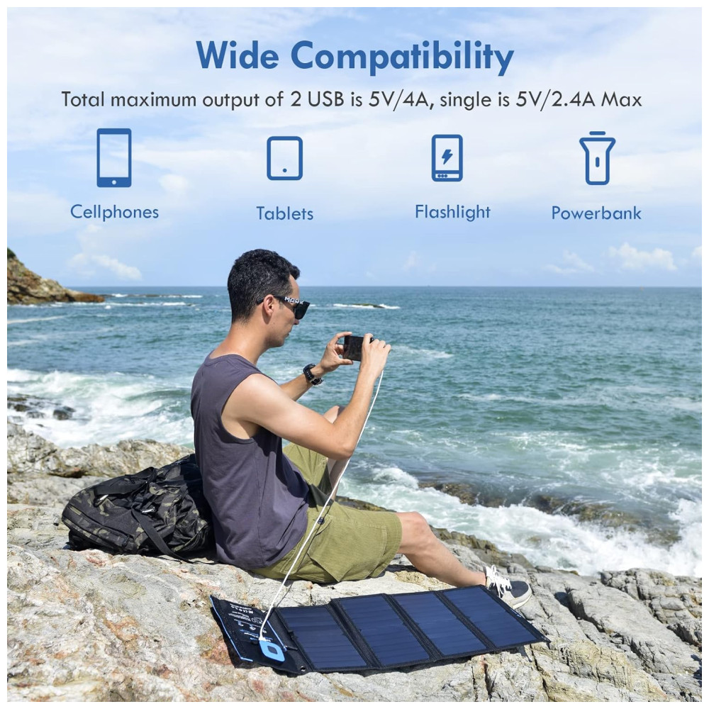 O valor dos Amps de nosso carregador solar de 28W depende de seus dispositivos, intensidade de luz solar e cabo .