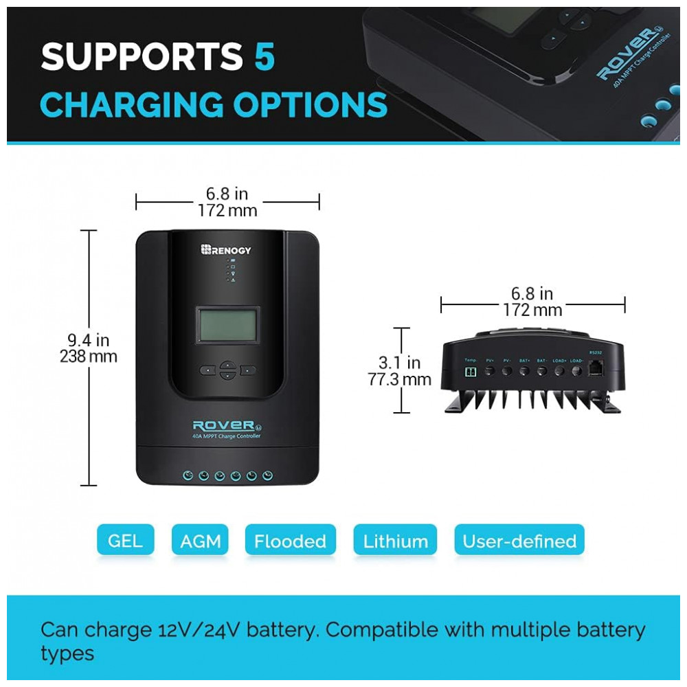 Painel Solar, Monocristalino, com controlador de carga, 100W, 12V, 1 painel, RENOGY RNG KIT STARTER100D RVR40, Preto: Este kit inclui nosso controlador de carga 40a mppt que usa tecnologia de rastreamento de ponto de potência máxima, transferindo energia até 30 mais eficientemente do que controladores de carga pwm Com um kit inicial mppt monocristalino de 100W Renogy, você não terá que se perguntar se está obtendo o máximo do seu sistema Eficiência da célula solar monocristalina 21 Eficiência de pico do controlador de carga MPT 97 tensão do circuito aberto voc 22,5V Você pode expandir seu sistema até um máximo de 400W 12 volts ou 800W 24 volts com um controlador de carga Renogy 40A mppt O pedido será entregue em vários pacotes Temperatura 40 F a 185 F